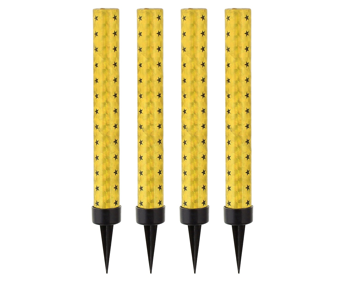 Az emlékezetes születésnapok és a torták elengedhetetlen kelléke a csillagszóró. Ez a csomag 4 db, arany-fekete mintás 12 cm-es csillagszórót tartalmaz. Átmérő: 10 mm.