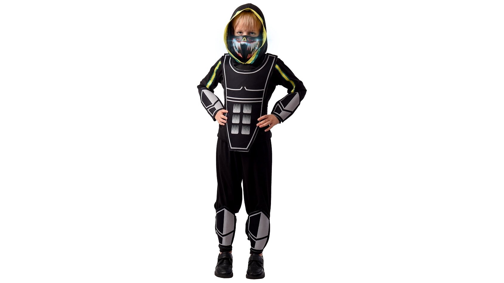 A jó minőségű jelmez 5 részből áll: Kapucnis felső, nadrág, maszk, páncél, kar- és lábvédők.