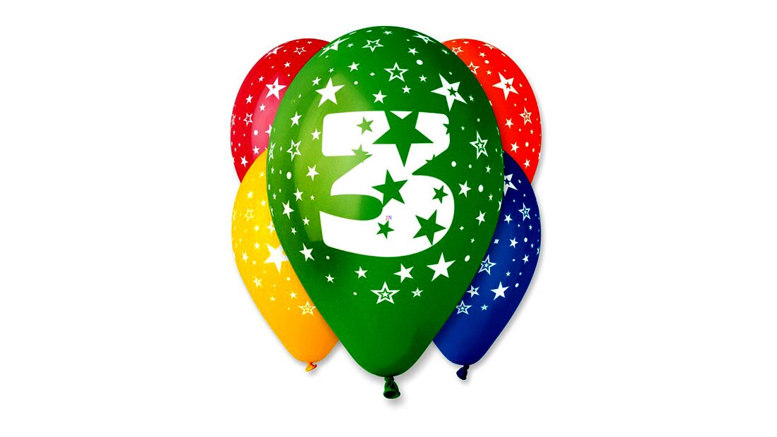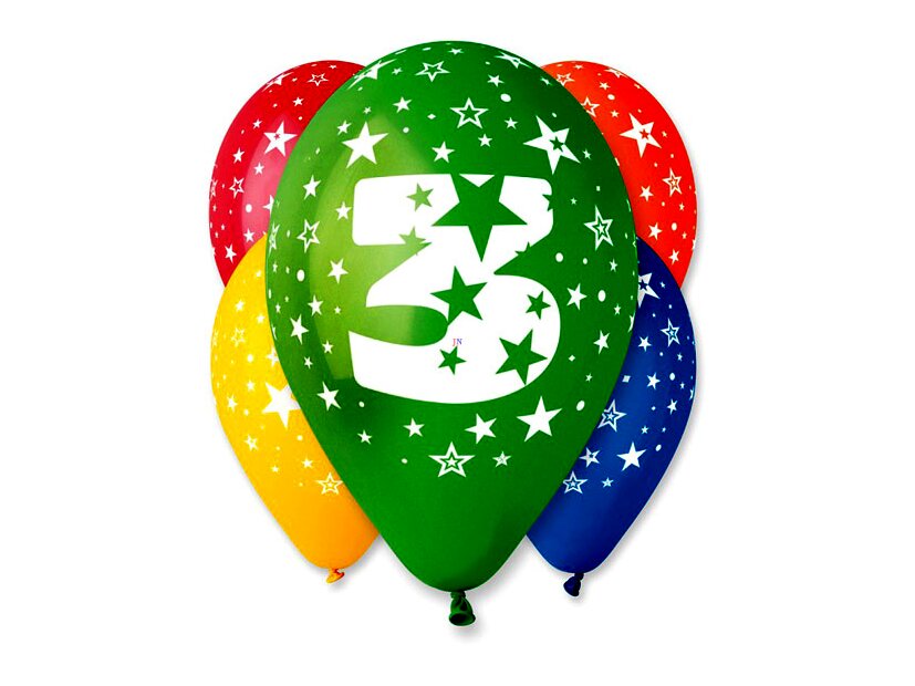 Gumiból készült, 3-as számot ábrázoló mintával ellátott lufik, vegyes színekben. A készlet 5 db lufit tartalmaz, ezekkel feldobhatod a saját vagy barátaid buliját! Csomagolás méretei: 14 x 20 x 3 cm