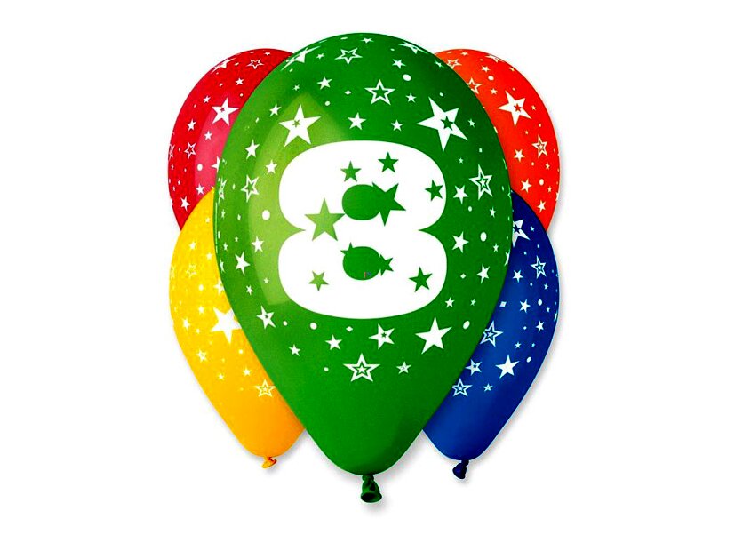 Gumiból készült, 8-as számot ábrázoló mintával ellátott lufik, vegyes színekben. A készlet 5 db lufit tartalmaz, ezekkel feldobhatod a saját vagy barátaid buliját! Csomagolás méretei: 14 x 20 x 3 cm
