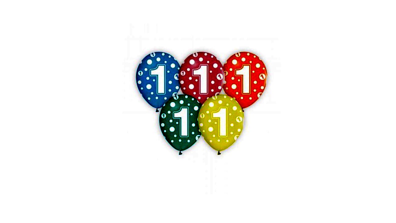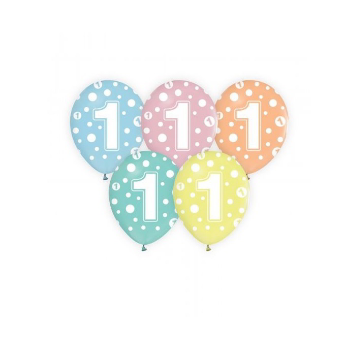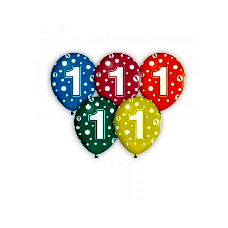 Színes, fehér pöttyökkel és 1-es számmal dekorált luficsomag. A szett 5 db lufit tartalmaz.