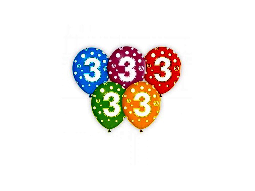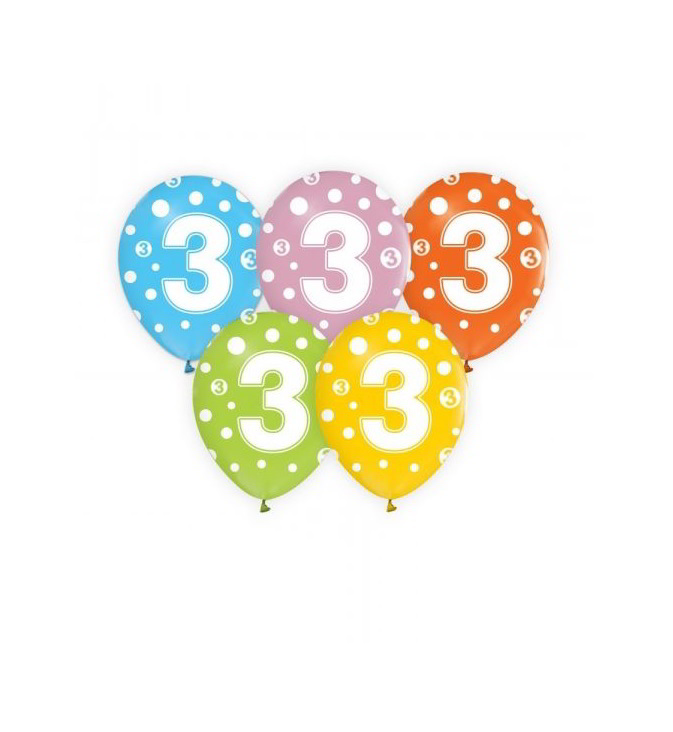Színes, fehér pöttyökkel és 3-as számmal dekorált luficsomag. A szett 5 db lufit tartalmaz.