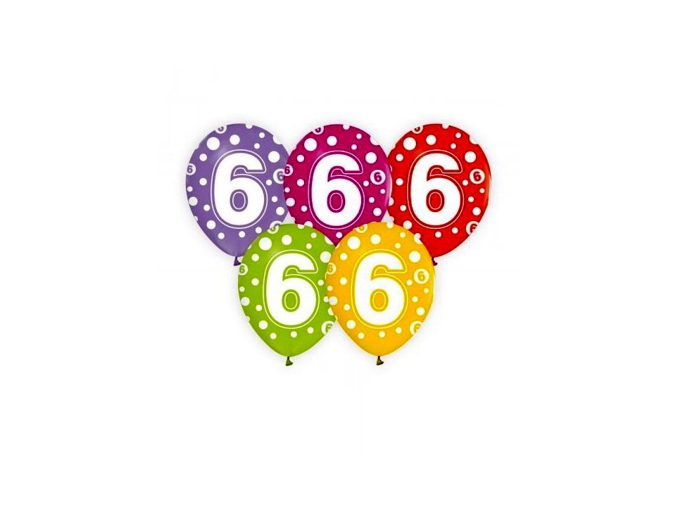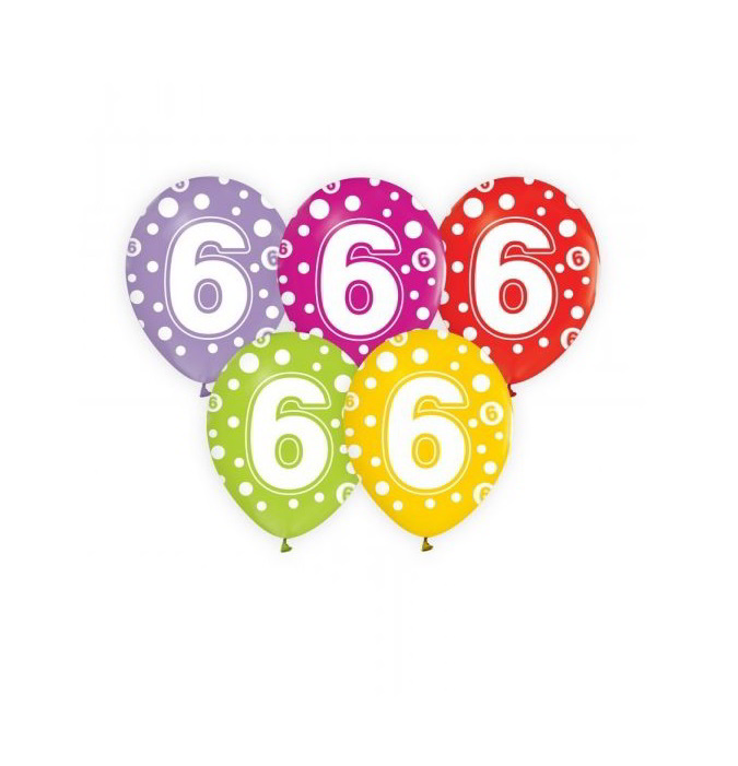 Színes, fehér pöttyökkel és 6-os számmal dekorált luficsomag. A szett 5 db lufit tartalmaz.