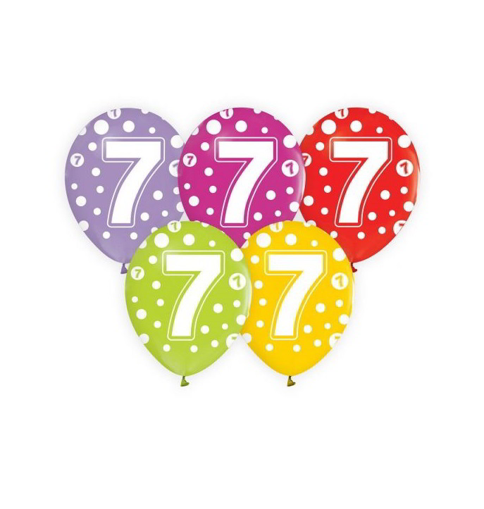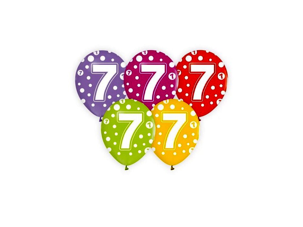 Színes, fehér pöttyökkel és 7-es számmal dekorált luficsomag. A szett 5 db lufit tartalmaz.