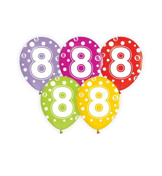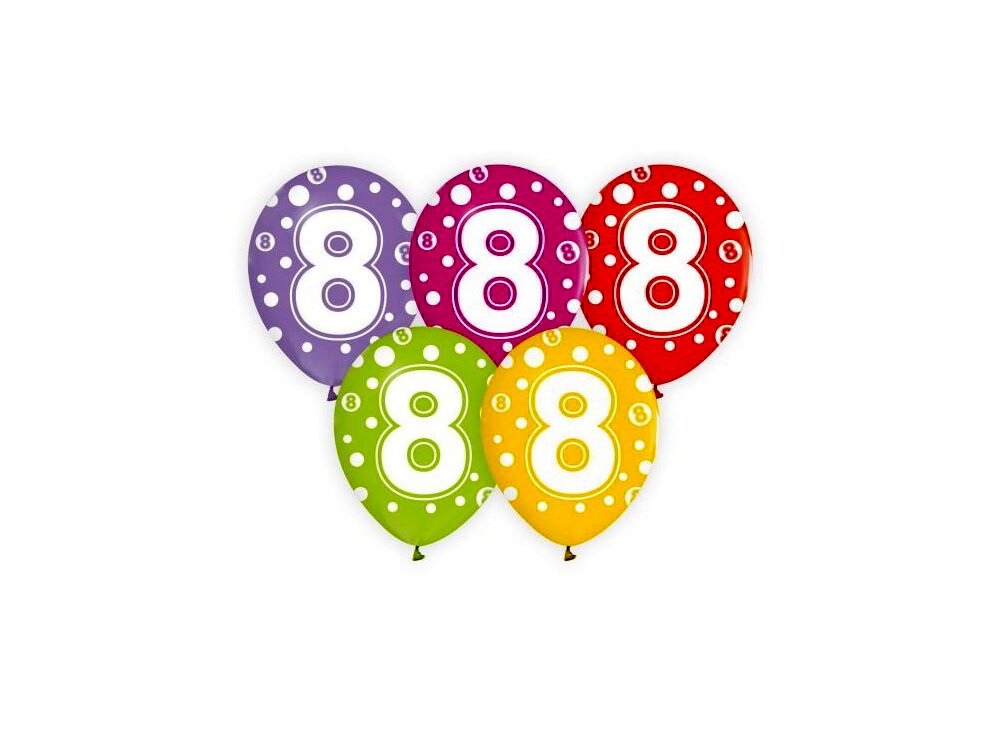Színes, fehér pöttyökkel és 8-as számmal dekorált luficsomag. A szett 5 db lufit tartalmaz.