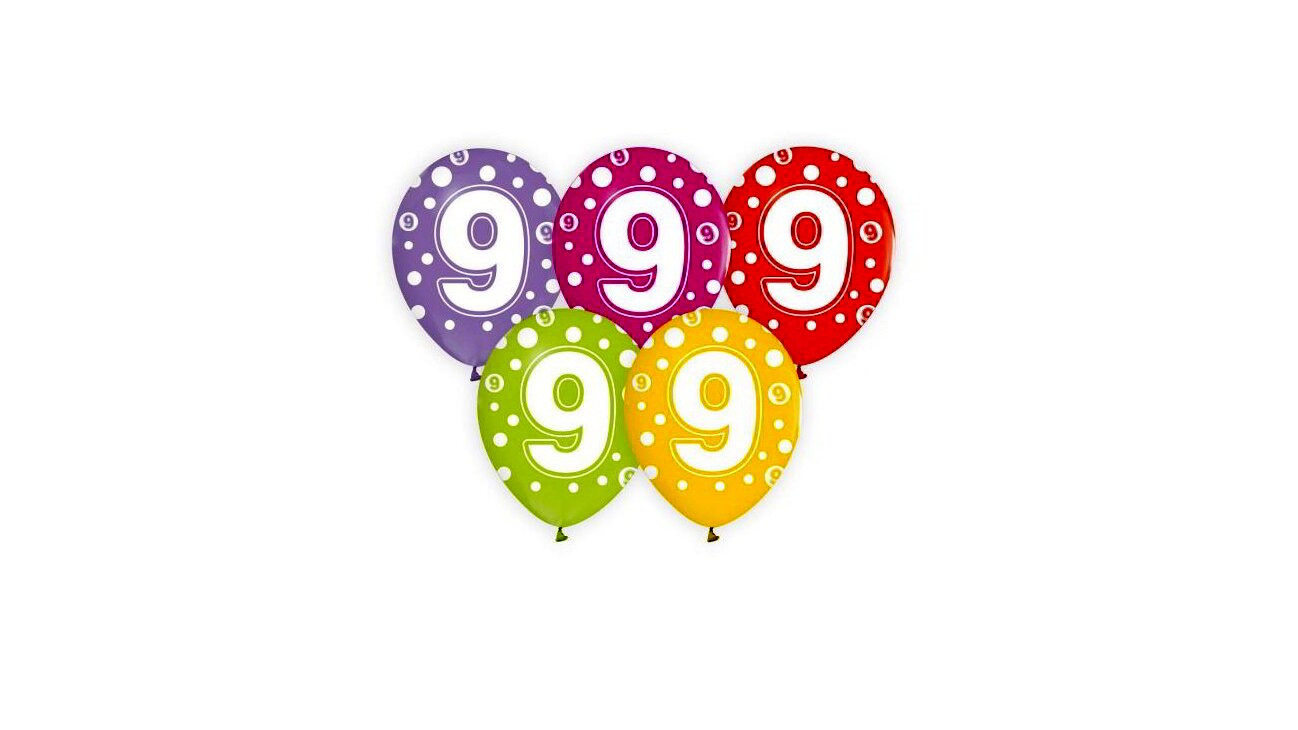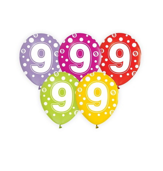 Színes, fehér pöttyökkel és 9-es számmal dekorált luficsomag. A szett 5 db lufit tartalmaz.