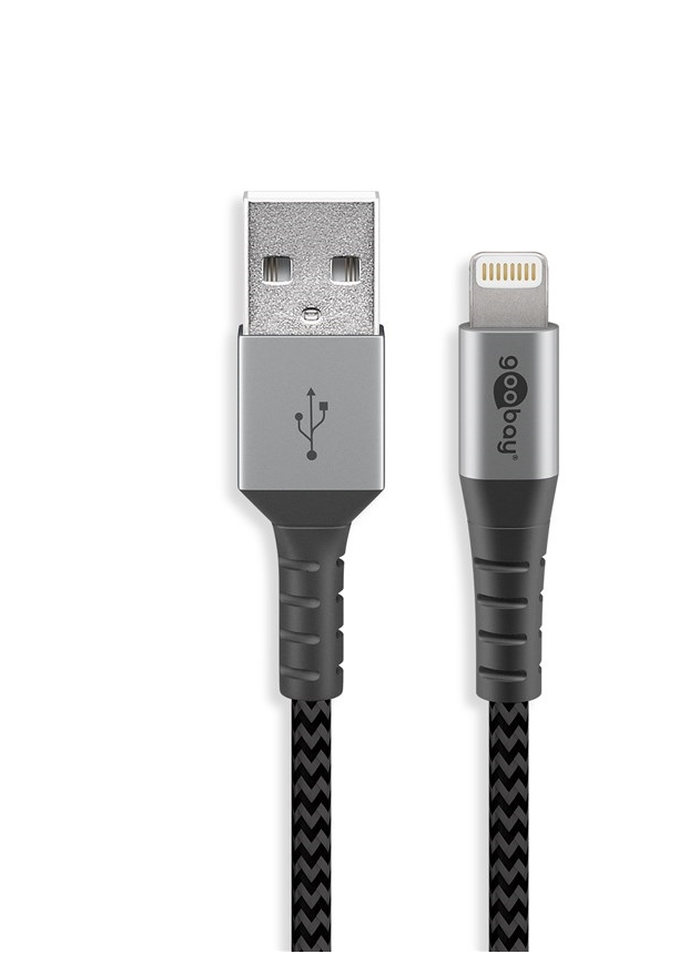 Flexibilis fekete textil bevonatú, lightning, adat és töltő kábel, szürke csatlakozókkal.
