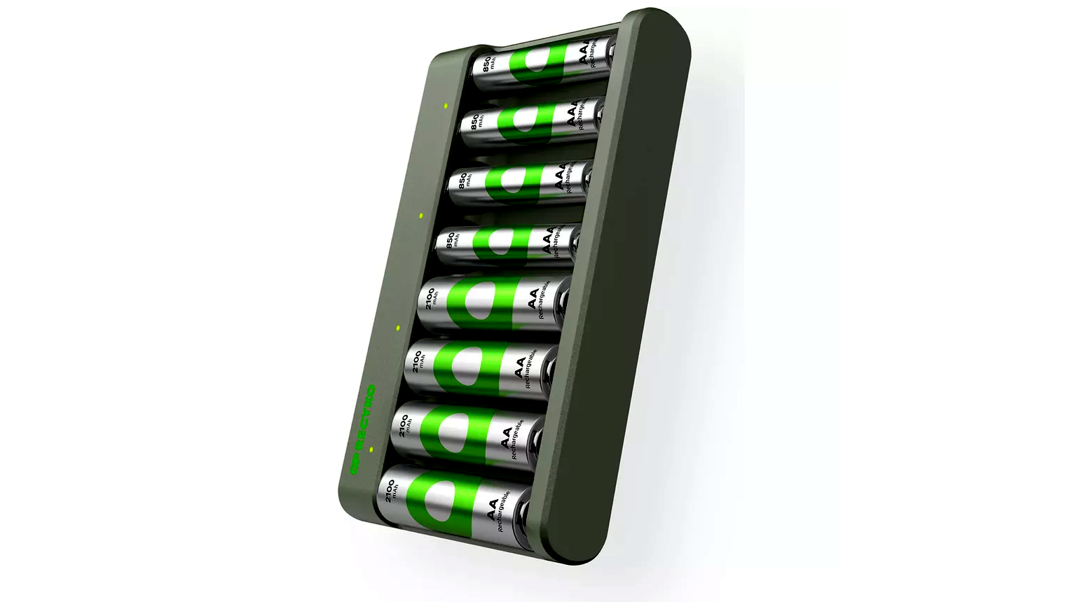 Ez a sokoldalú töltő USB-n vagy bármely GP ReCyko töltődokkon keresztül működik (kifejezetten a B421 és M451 ReCyko töltőhöz tervezve). Négy újratölthető AA 2100 és AAA 850 mAh akkumulátort tartalmaz.