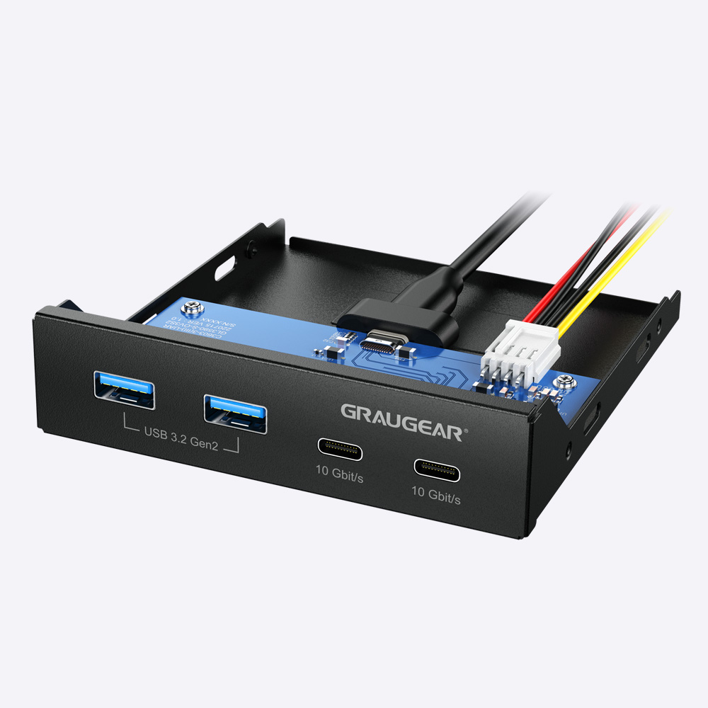 A GRAUGEAR G-MP02 előlapja véget vet az "asztal alá és a számítógép mögé kúszásnak". A 2x USB Type-C® és 2x USB Type-A csatlakozókkal semmi sem áll a gyors és kényelmes