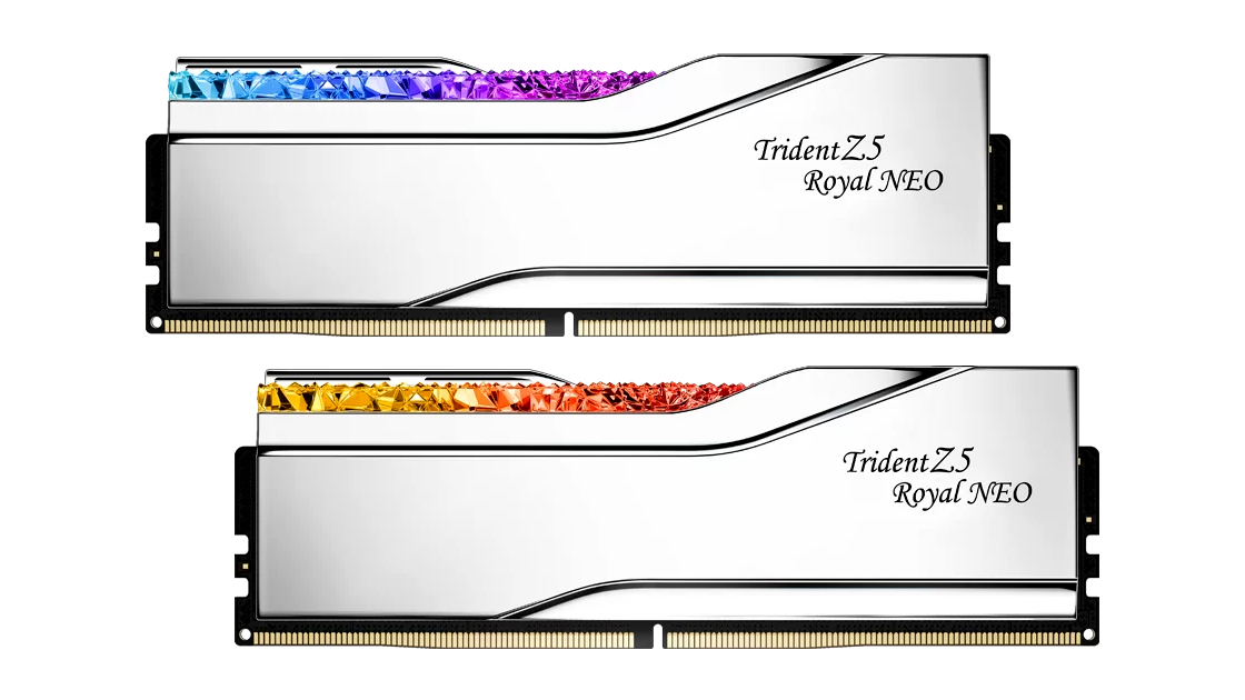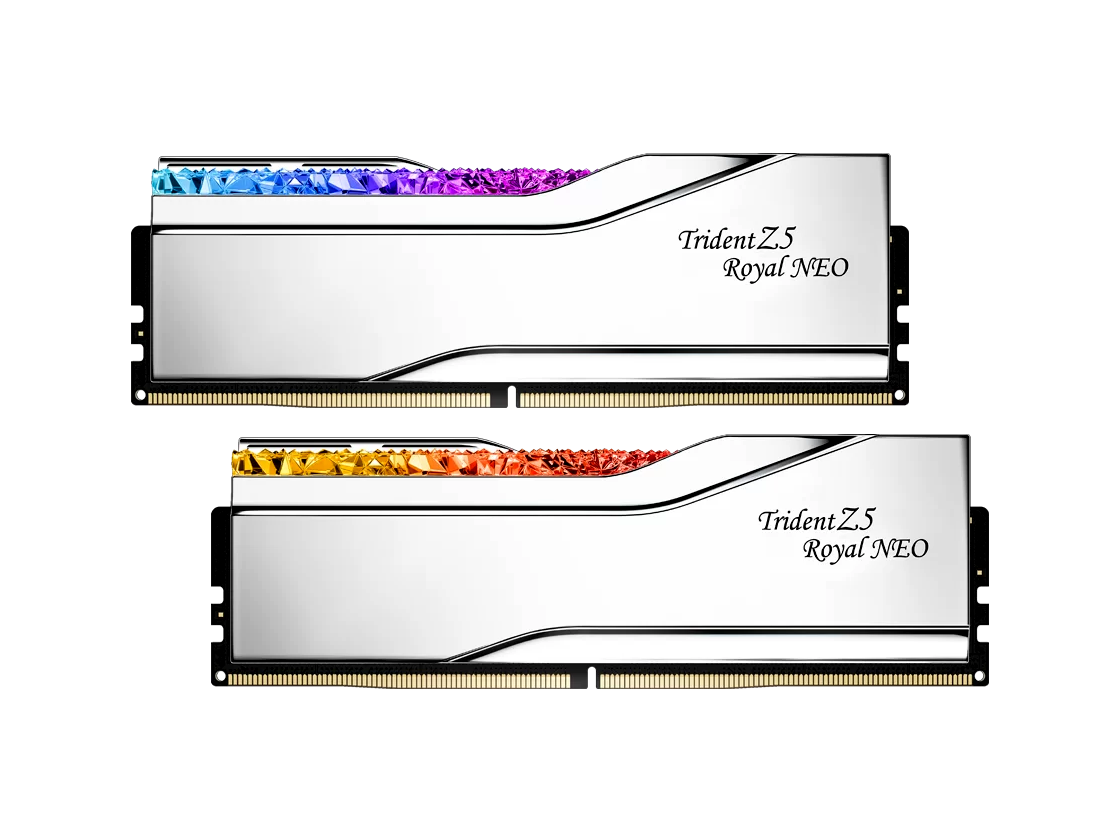 A Trident Z5 Royal Neo a G.Skill luxuskategóriás DDR5 memóriája, amely az AMD AM5 platformokhoz készült. A RAM memória kristályszerű fényrudakkal és tükörfényes alumínium hűtőbordákkal teszi elegánssá és lenyűgözően egyedivé a PC-d megjelenését. A pompás ezüst vagy arany színváltozatok a PC építészetének kiemelkedő ékei lesznek.