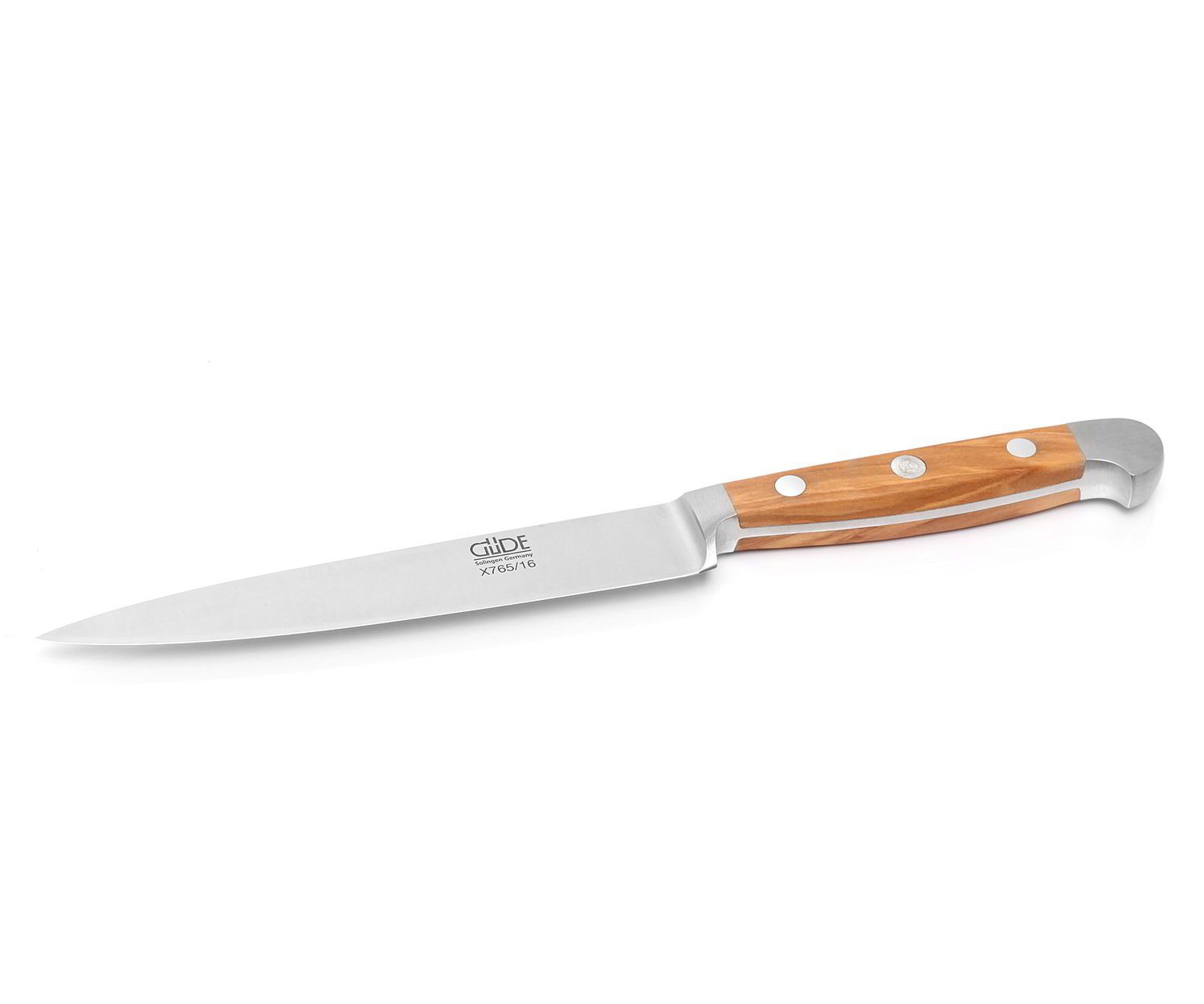 A króm-vanádium-molibdén késacélból készült kézzel kovácsolt penge egy darabból készül, rozsdamentes jégkeményedéssel és kézzel élesítve. Az Alpha Olive sorozatból származó Güde előkészítő kés optimálisan kiegyensúlyozott, finoman polírozott fogantyútálcája régi, válogatott olíva fából készül. A szegecsek rozsdamentes acélból készülnek, a tenyér szegecsek nem rozsdamentes alumíniumból. A fából készült fogantyúkkal ellátott Güde kések semmilyen körülmények között nem tehető a mosogatógépbe.