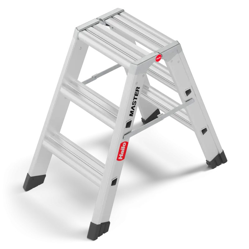A Hailo Master D80 kétoldalas, 2 x 3 fokos összecsukható fellépő ideális választás otthoni, ipari és professzionális felhasználásra, ha stabil, kényelmes és tartós munkaeszközre van szükség. Nagyméretű állófelülete, kétoldali használhatósága és csúcsminőségű anyagai révén különösen biztonságos munkavégzést tesz lehetővé magasabb területeken is.