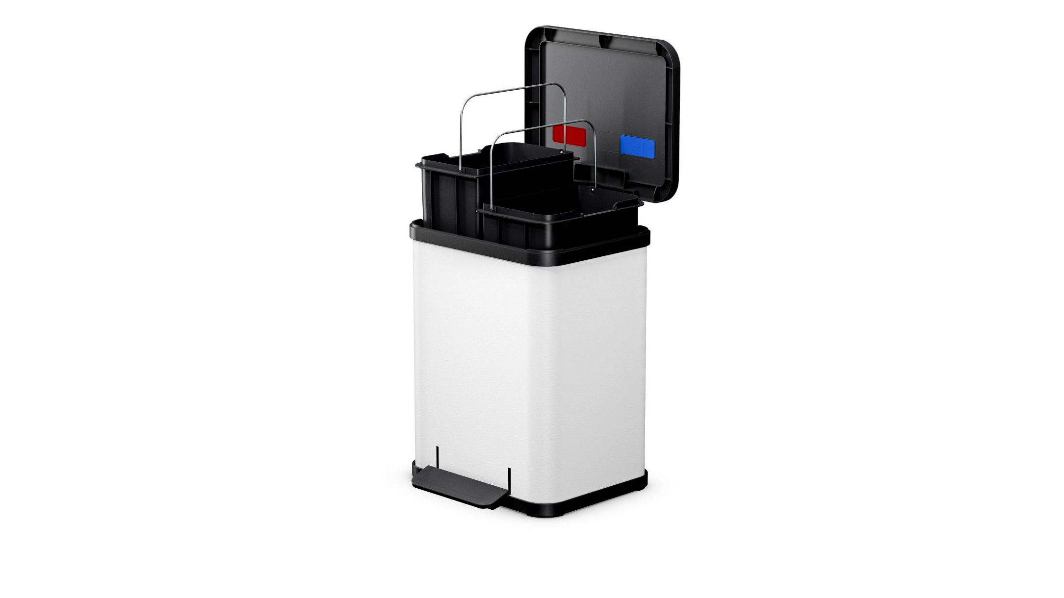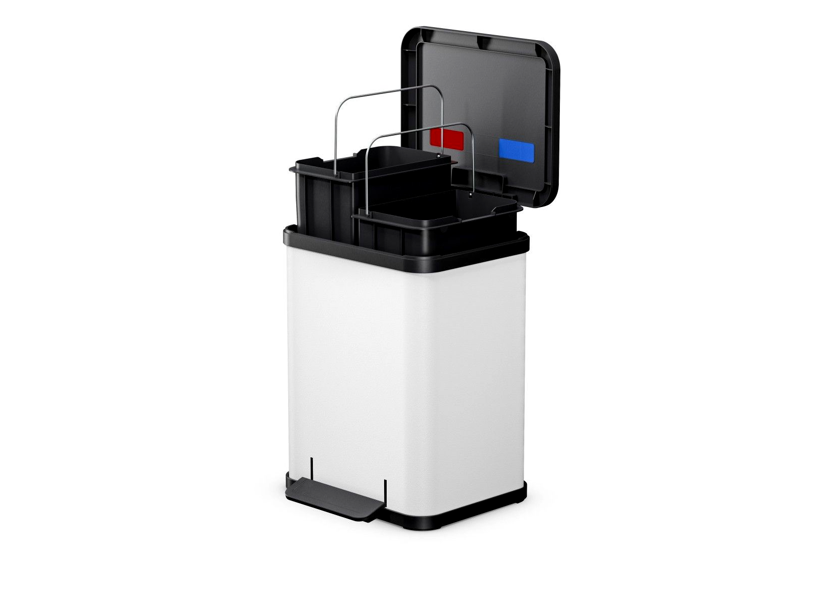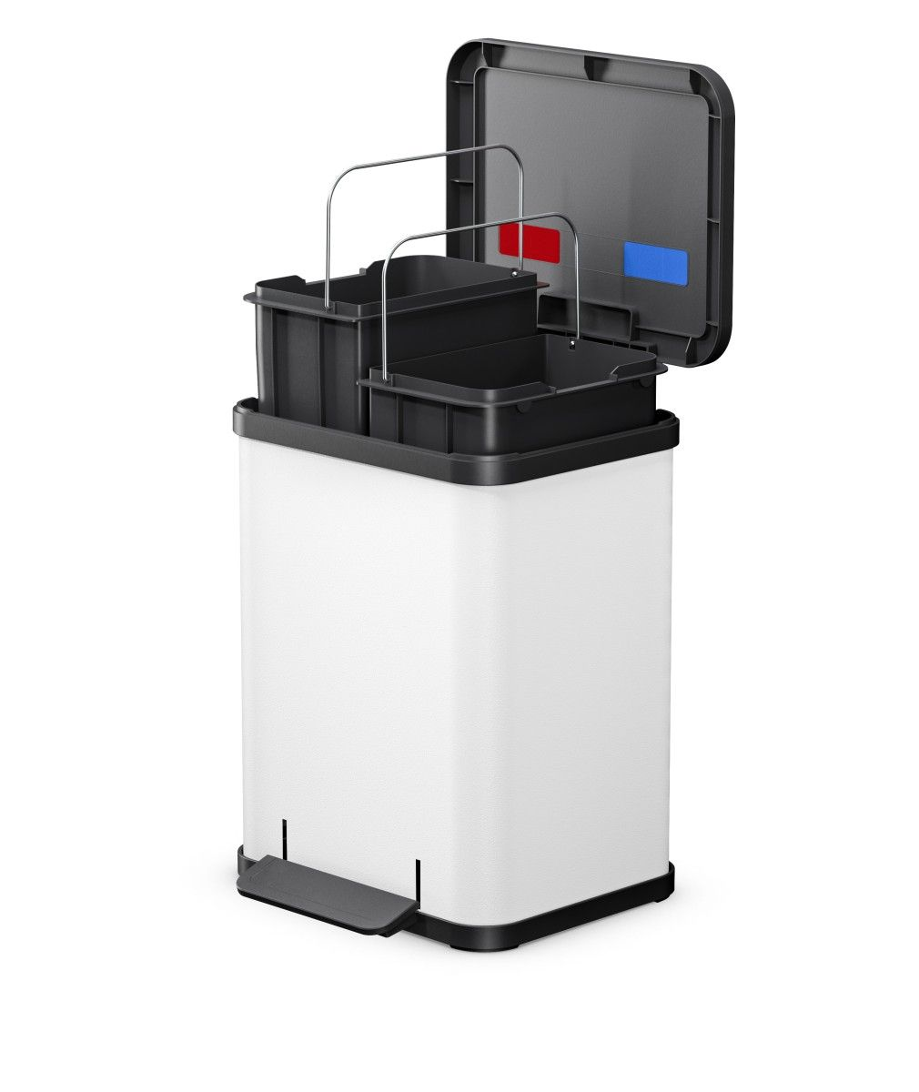 • 100% újrahasznosított műanyag belső: a két kivehető belső vödör teljes mértékben újrahasznosított műanyagból készült, így a termék nemcsak a szelektív gyűjtést támogatja, hanem magában is környezettudatos választás.