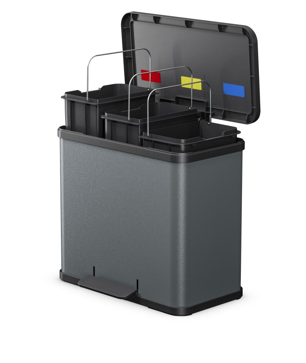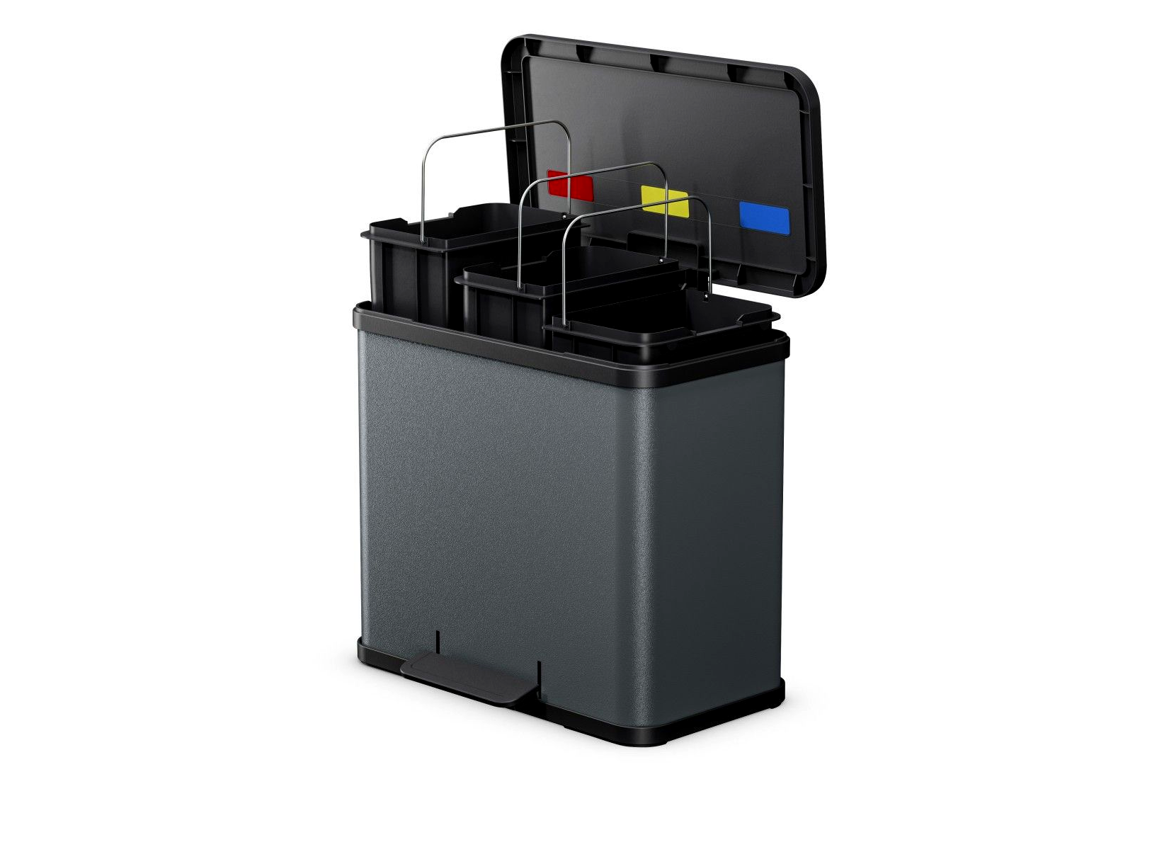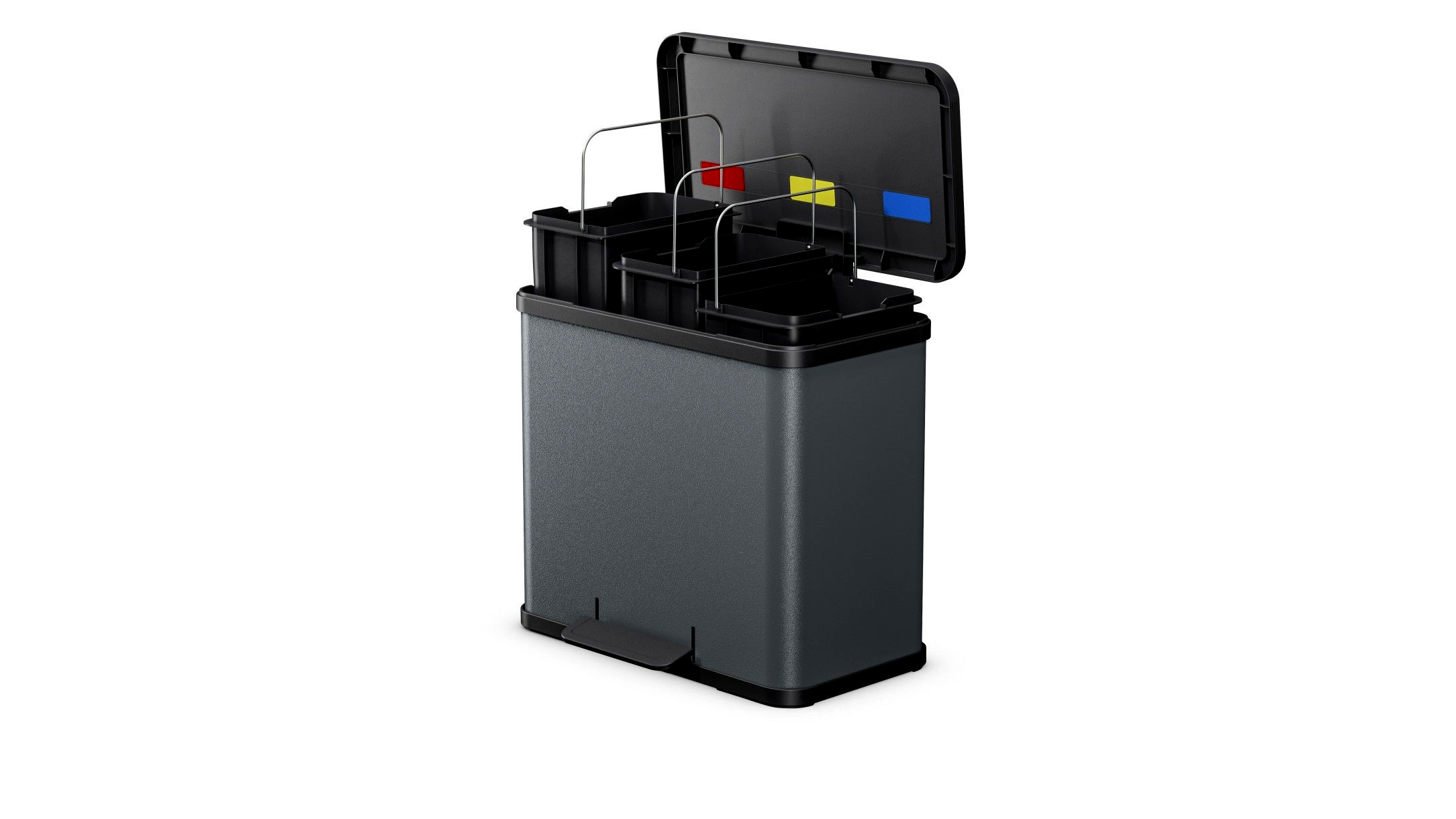 A belső tér három különálló, egyenként 9 literes műanyag tartályra oszlik, így egyszerűen szétválasztható például a papír, műanyag és kommunális hulladék. A tartályok kivehetők, így a kiürítés és tisztítás gyors és higiénikus.