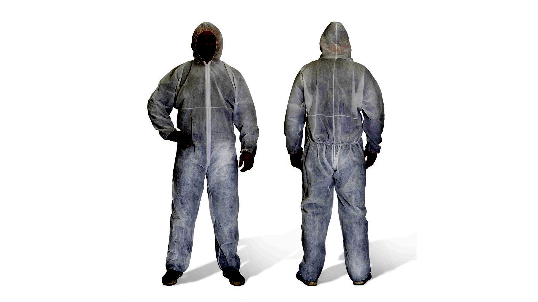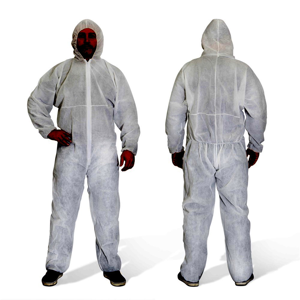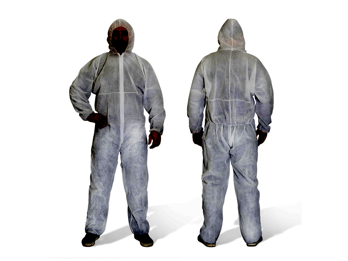 Egyszer használatos, eldobható, univerzális méretű (XL), kapucnis védőoverál, cipzáras záródással, gumírozott csukló -, arc - és bokarésszel.