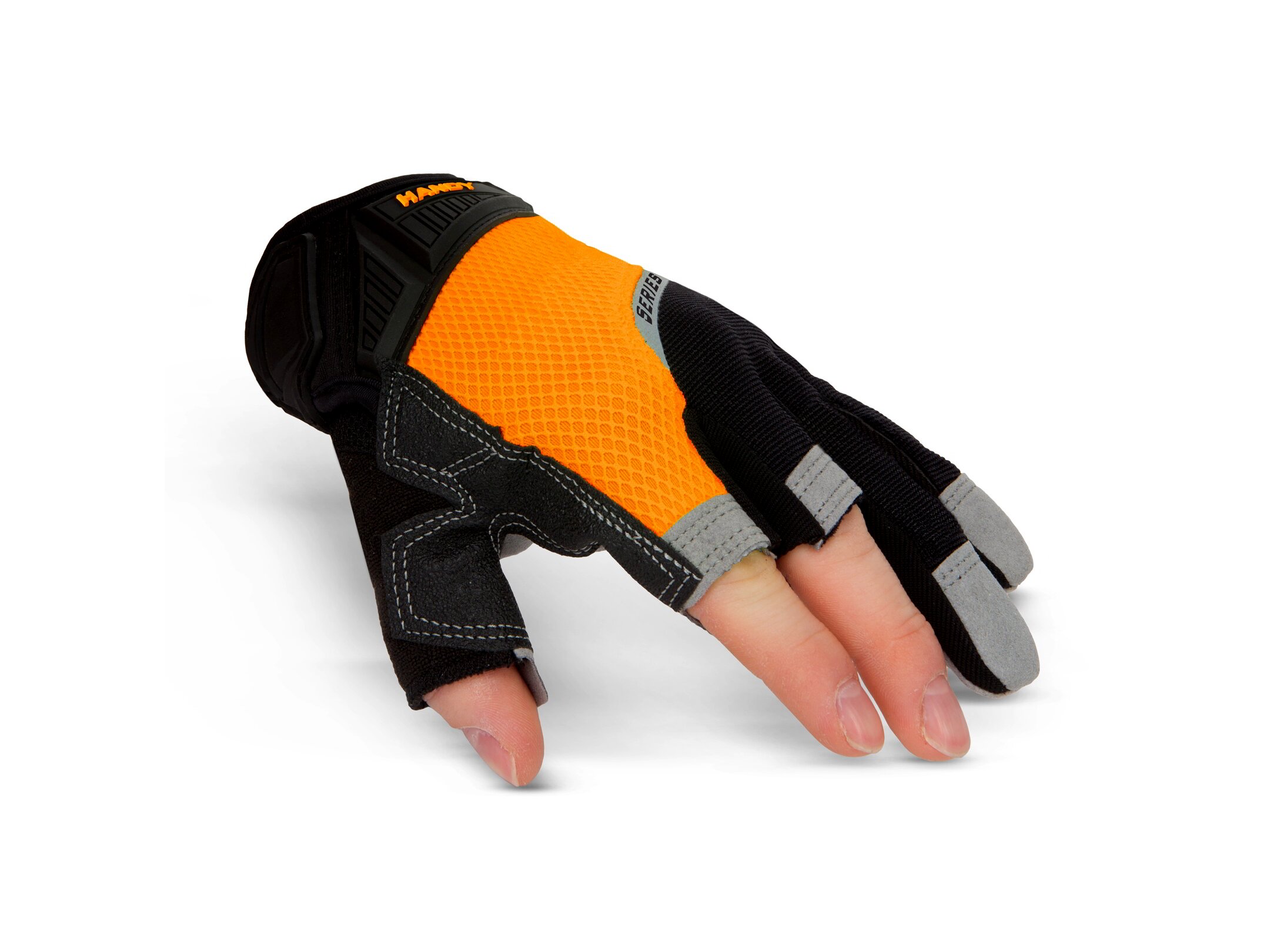 Kiváló fogásbiztonságot nyújtó kesztyű profiknak. Szintetikus bőrből, habosított tenyér résszel, megerősített varrásokkal és 3 nyitott ujjal rendelkezik. Rugalmasságot és védelmet biztosító kézhát, spandex anyagból. A 3 nyitott ujjnak köszönhetően az érintőképernyők kezelése, a finom mozgásokat, fogásokat igénylő feladatok precízen elvégezhetőek. A megfelelő rögzítésről extra erős tépőzár gondoskodik.