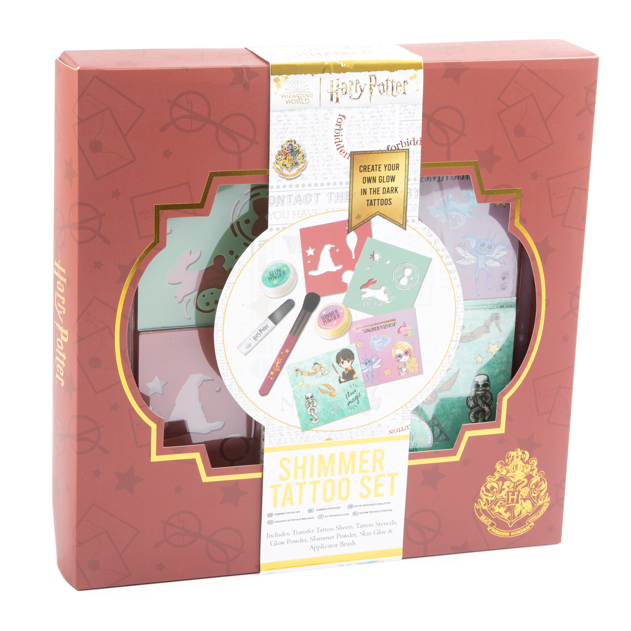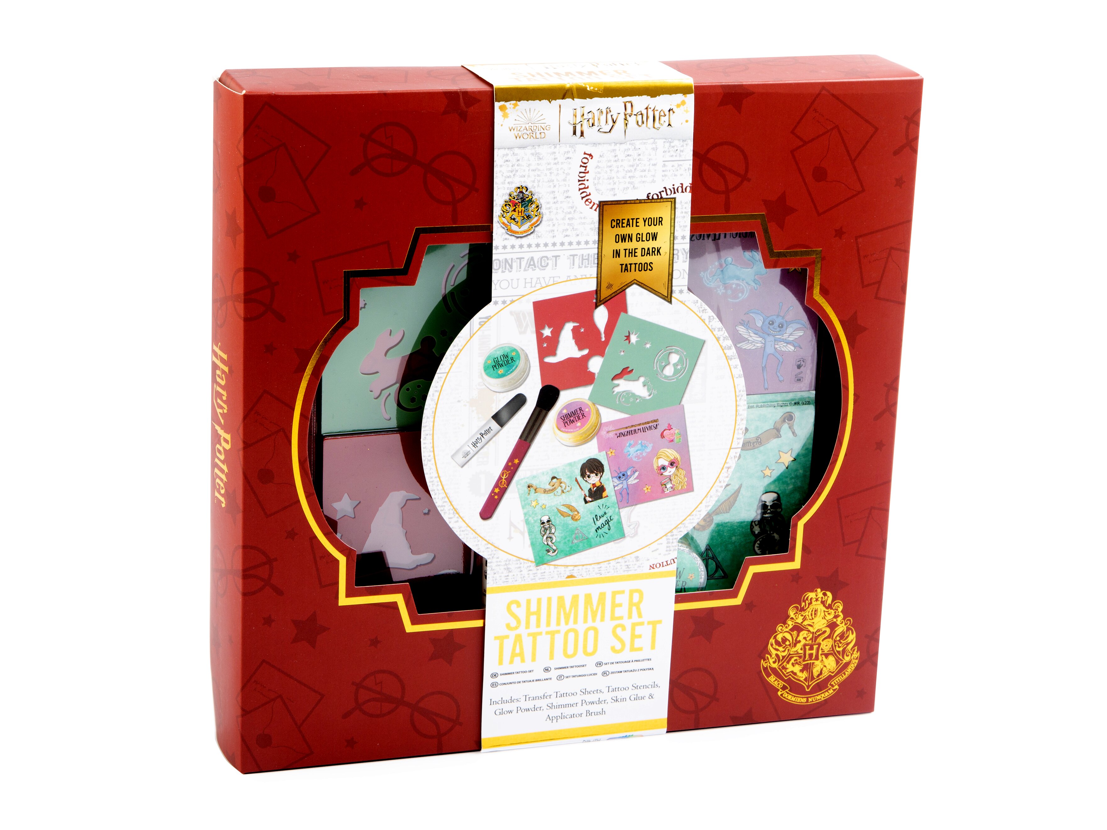Ahhoz, hogy a kis varázslók tudják, ki az, akik az ő oldalukon áll, és ki az, aki a Sötét Nagyúr seregének tagja, érdemes egy közös ismertetőjegyet magukon hordani: erre teremt lehetőséget a Harry Potter világát idéző varázslatos csillámtetoválás szett. A készlet mindent tartalmaz, ami a menő, sötétben világító tetoválások elkészítéséhez szükséges: stencileket, ragasztót, csillámot, sőt, még egy applikátort is, amellyel még egyszerűbb lesz a testet díszítő alkotás elkészítése. A csillámtetoválások eltávolítása egyszerű: meleg, szappanos vízzel és kis dörzsöléssel könnyen leszedhetők.