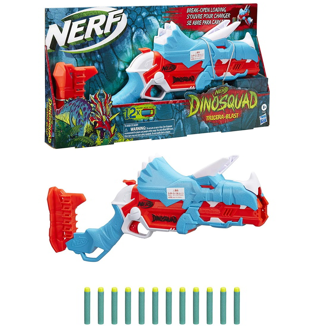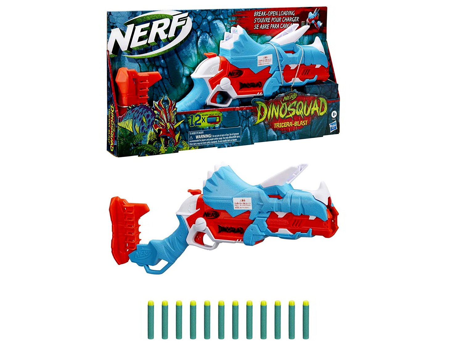 Merülj el a lenyűgöző dinoszauruszok világában a Hasbro Nerf DinoSquad Tricera-Blast szivacslövő fegyverrel. A Triceratops dizájn inspirálta fegyverrel most minden akadályt legyőzhetsz és uralhatod a harcteret!