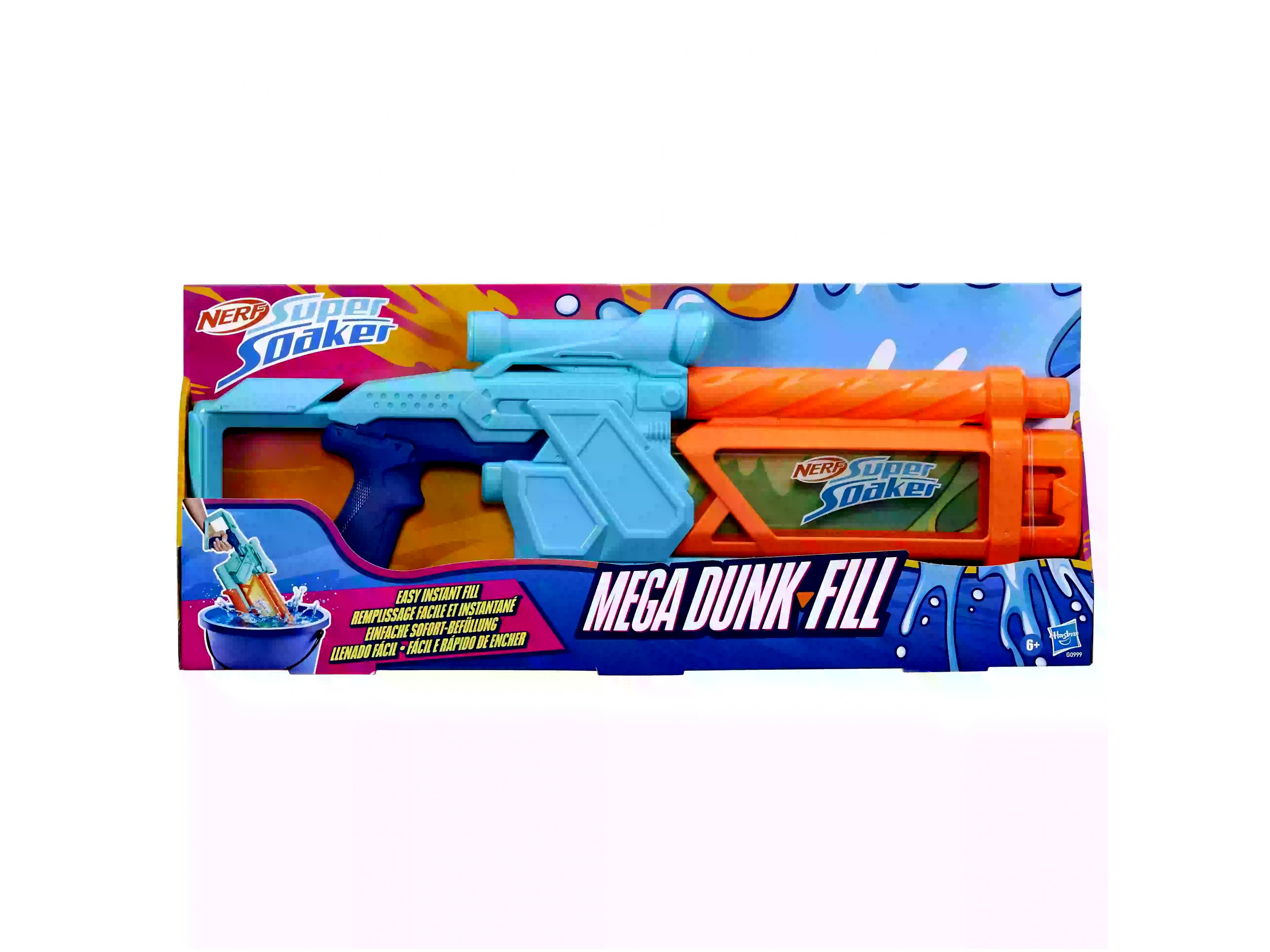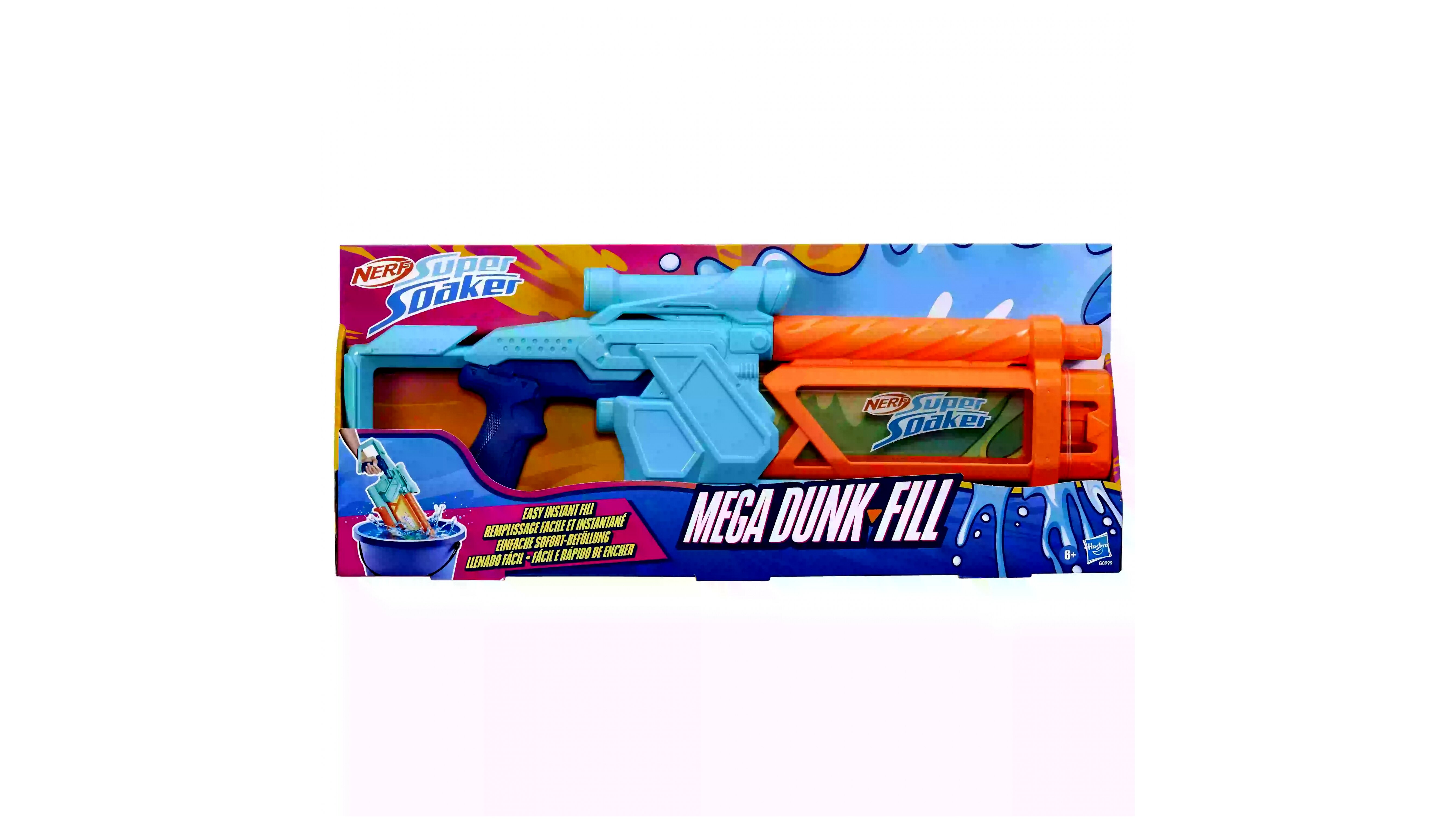 A Nerf Super Soaker Mega Dunk Fill vízipisztoly különlegessége a gyors töltésű tartály, amely akár 1005 ml vizet is képes befogadni. Csak merítsd vízbe, és nézd, ahogy azonnal feltöltődik! Az áttetsző tartály megkönnyíti a töltöttség ellenőrzését, így mindig készen áll a következő csatára. A tartálytöltés után nincs más dolgod, mint célozni és tüzelni a pumpakar előre-hátra mozgatásával.