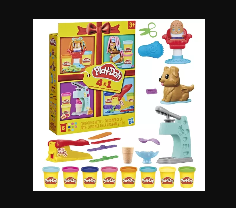 Tartalom (főbb elemek): fodrász-kiegészítők, jégkrémkészítő eszközök, kutya ápoló mini szett, Play-Doh Fun Factory 15 formával, 8 tégely színes gyurma