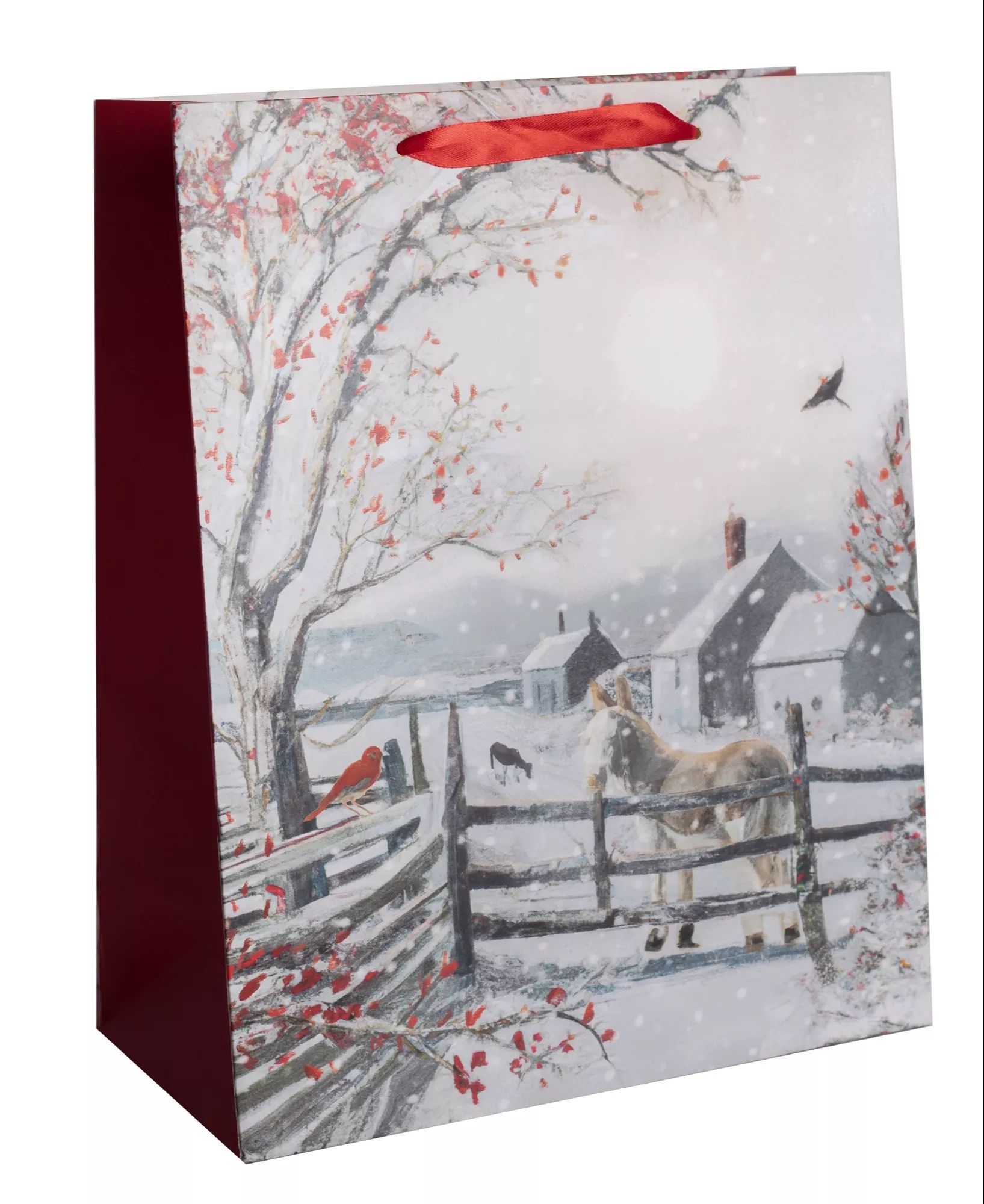 Fejezze ki szeretetét és gondoskodását környezettudatos módon ezzel a hangulatos havas farm mintás ajándéktasakkal!