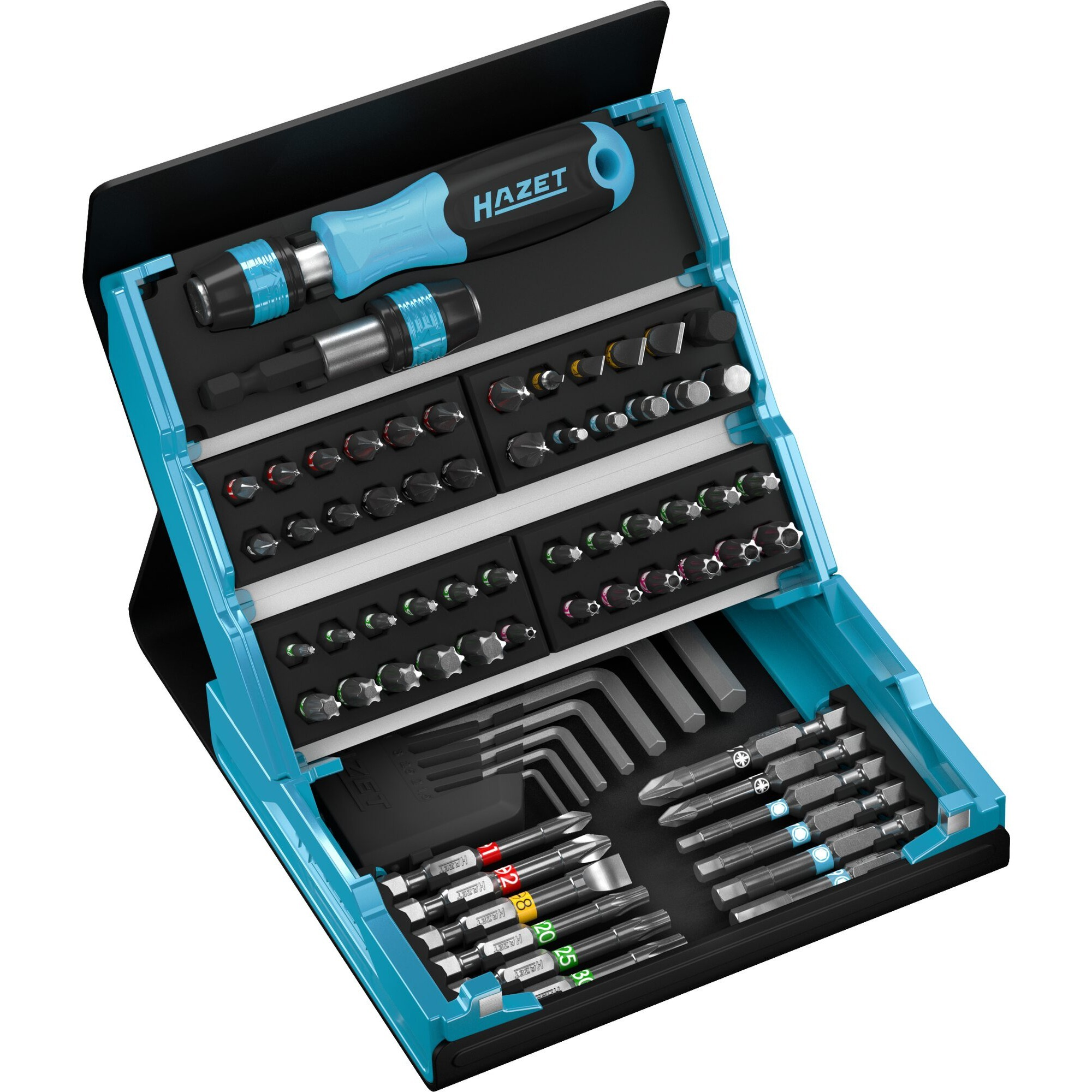 A Hazet 2200SC-1 bitkészlet 7 offset csavarhúzót, 12 hosszú bitet, 48 rövid bitet, egy csúszásmentes Hazet 3 komponensű fogantyúval ellátott bittartót és egy bitadaptert tartalmaz, mindkettő bajonettzárral a bitek és csavarok biztonságos rögzítése érdekében. A készlet hornyos, Phillips, TORX, Tamper Resistant TORX és hatszögletű foglalatprofilú biteket tartalmaz. A 2200SC-1 bitkészletet SmartCase tokban szállítjuk. Az innovatív SmartCase kompakt, összecsukható szerszámkészletet tesz lehetővé, könnyen letörölhető anyaggal és kellemes tapintással. Egyesíti a vékony, könnyű textiltáska előnyeit a keményhéjú szerszámtáskák robusztusságával. A tartós, robusztus szorítótartók megakadályozzák, hogy a szerszámok szétrepüljenek vagy zörögjenek, és a legkisebb helyen is stabil, könnyen hozzáférhető tárolást biztosítanak sok szerszámnak a legjobb áttekinthetőség mellett. A kopásmentes mágneses rögzítő gyorsan nyitható, a szerszámok könnyen kivehetők, és a SmartCase akár laposan is kinyitható, akár tablet-táskaként felállítható.