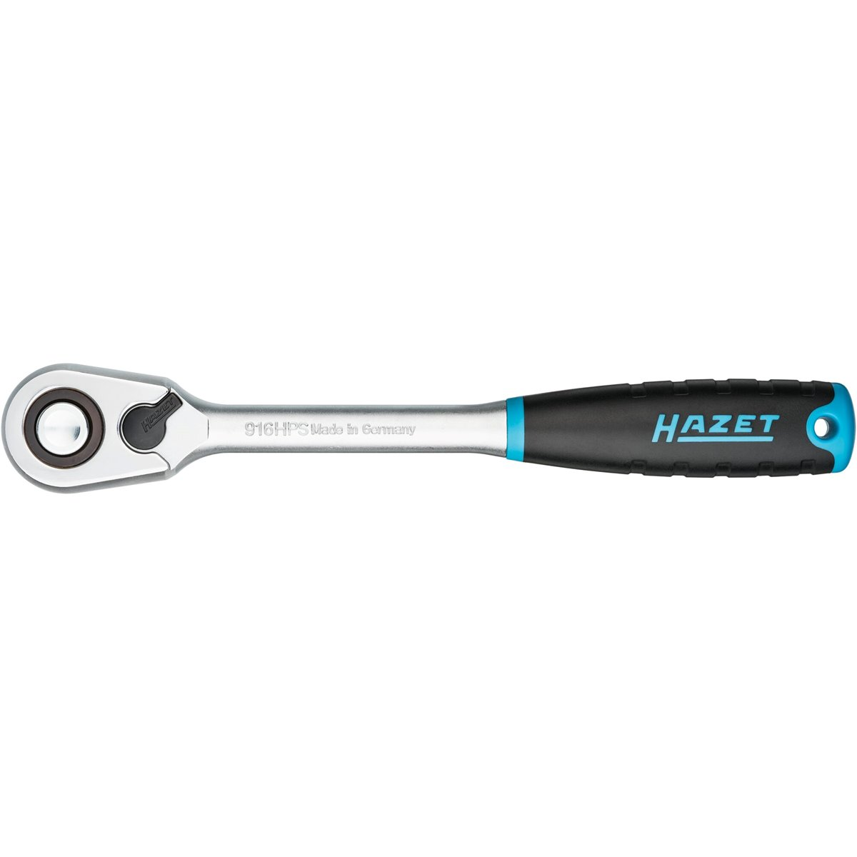A HAZET 916HPS HiPer finomfogú, megfordítható racsnija nagyon kis, 4°-os működési szöggel és 90 foggal lehetővé teszi a legszűkebb beépítési helyeken, pl. motoroknál, gépészetben, mezőgazdasági járművekben és berendezésekben való használatot. A felhasználó- és szervizbarát, megfordítható racsni integrált megfordítható karral meggyőzően hosszú élettartammal rendelkezik, mivel a racsni mechanizmusban a legújabb kenőanyagokat használják. A szűk gyártási tűrések védelmet nyújtanak a behatoló szennyeződések ellen, a bevált HAZET minőség pedig a szabványosnál jóval nagyobb terhelhetőséget tesz lehetővé. A kar reteszelő funkciója védelmet nyújt a munka közbeni véletlen kapcsolás ellen. A könnyen tisztítható, korrózióálló 916HPS HiPer fordítható racsni golyós zárral és gyorskioldó biztonsági zárral is rendelkezik a foglalatok biztonságos rögzítéséhez. A kioldógomb megnyomásával a csatlakoztatott szerszám egy kézzel gyorsan újra kioldható.