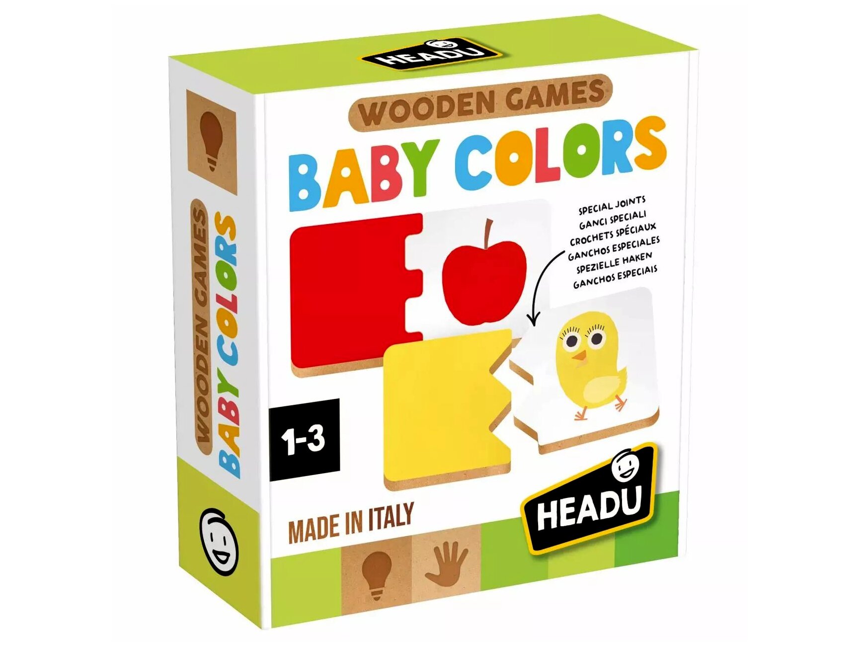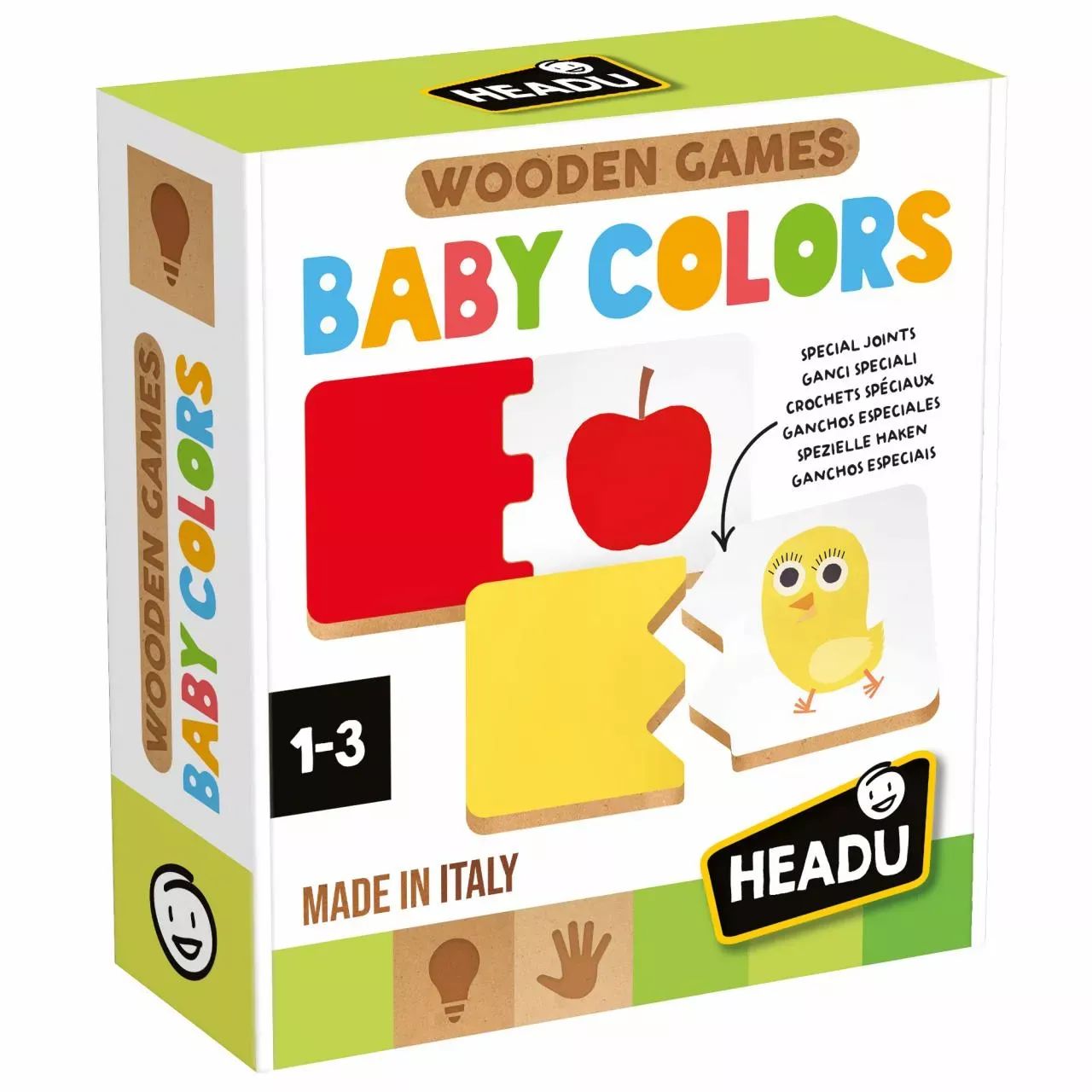 A készlet 12 darab masszív, fából készült lapot tartalmaz, melyeken vidám, könnyen felismerhető tárgyak és azok jellegzetes színei szerepelnek. A gyermekek megtanulják, hogy például a csibe sárga, az alma piros, és játékosan ismerkednek az elsődleges és másodlagos színekkel is. A darabok speciális illesztésekkel kapcsolódnak egymáshoz, így a kicsik párosítva, összekötve fedezhetik fel, melyik szín melyik tárgyhoz tartozik.