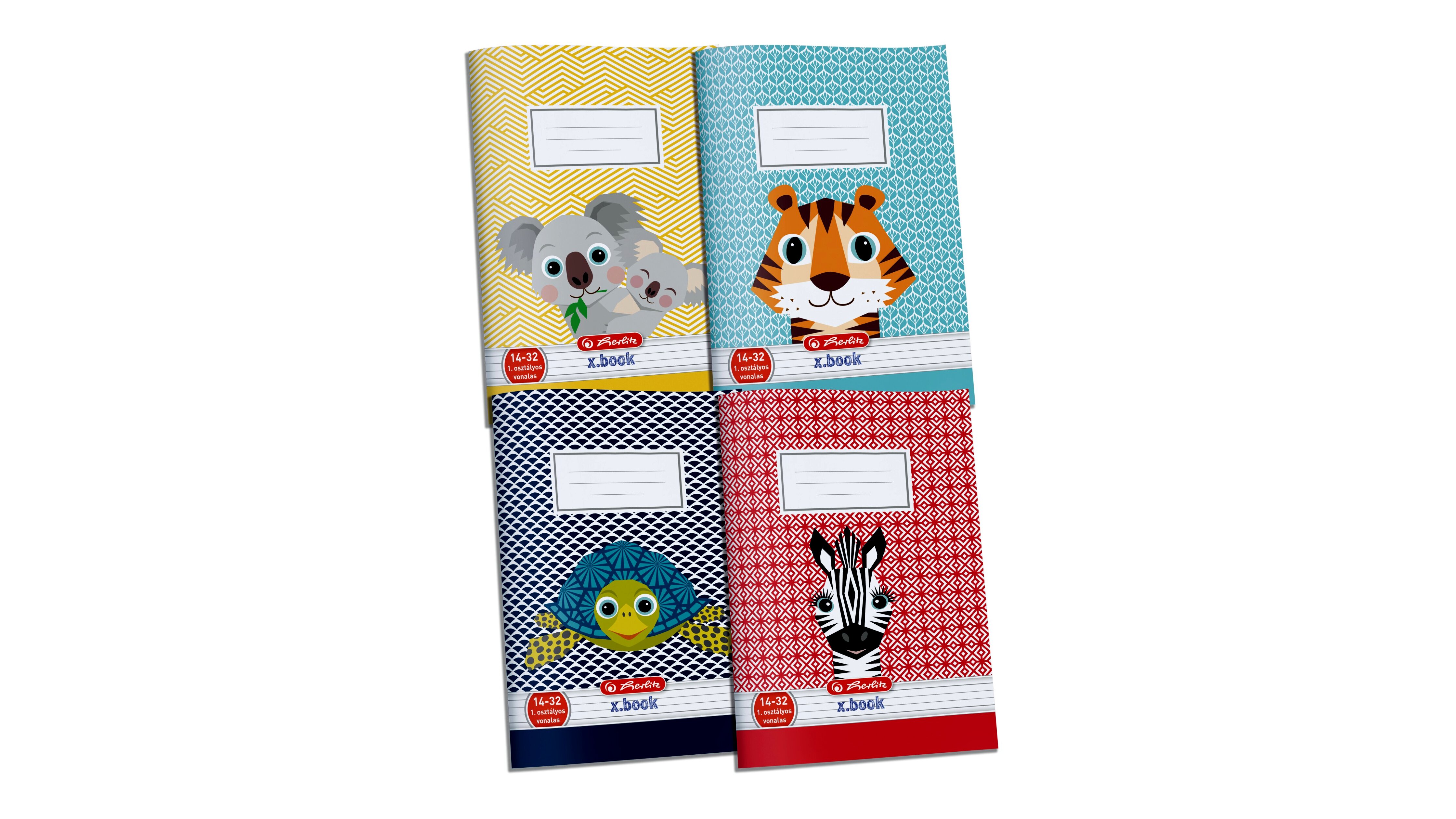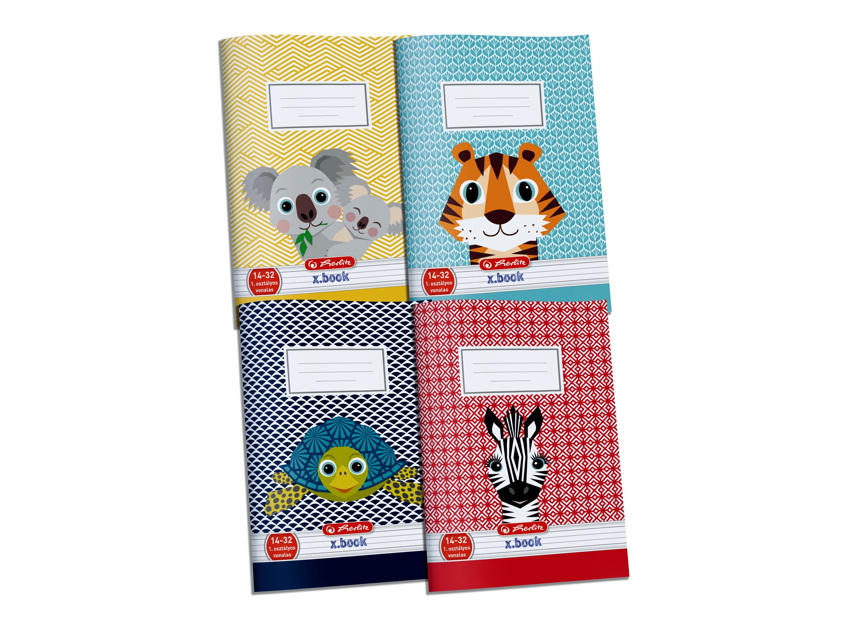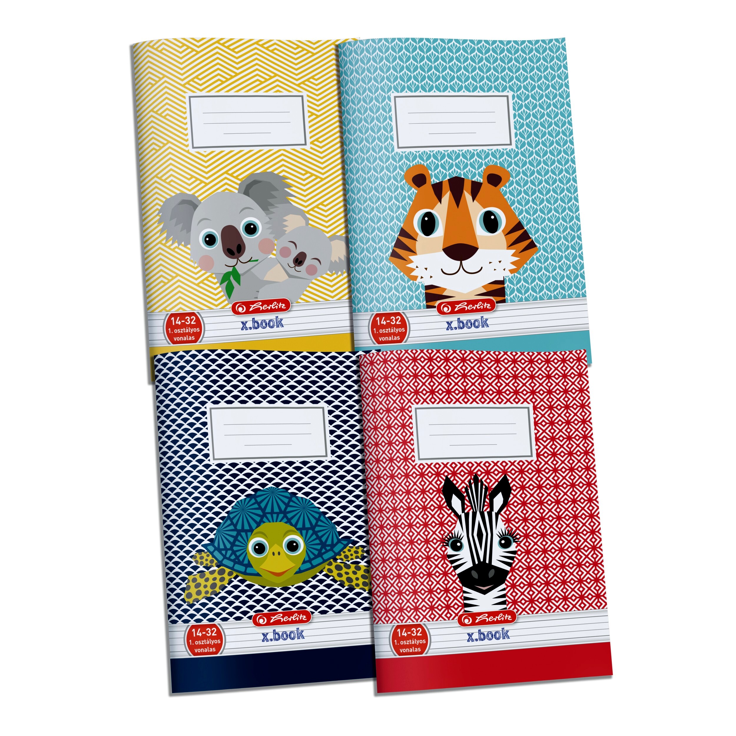 A5-ös méretű, 32 lapos cuki állat mintás, kapcsozott füzet, első osztályos vonalazással, hófehér belívvel és mintás fedlappal.