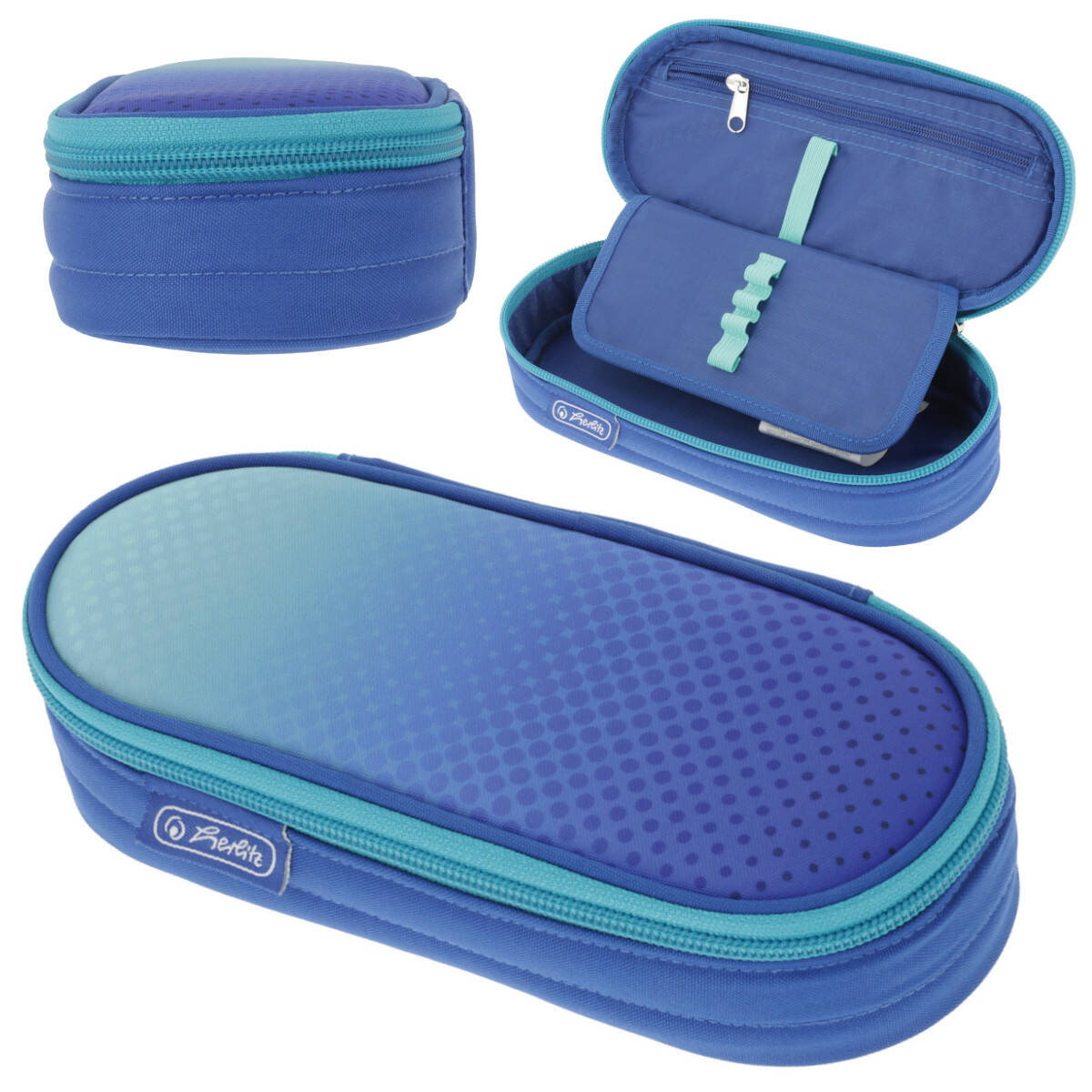 Üres tolltartó ovális, 21,5x9x6 cm-es méretben, belső fedelén írószertartó gumipántokkal és cipzáras zsebbel.