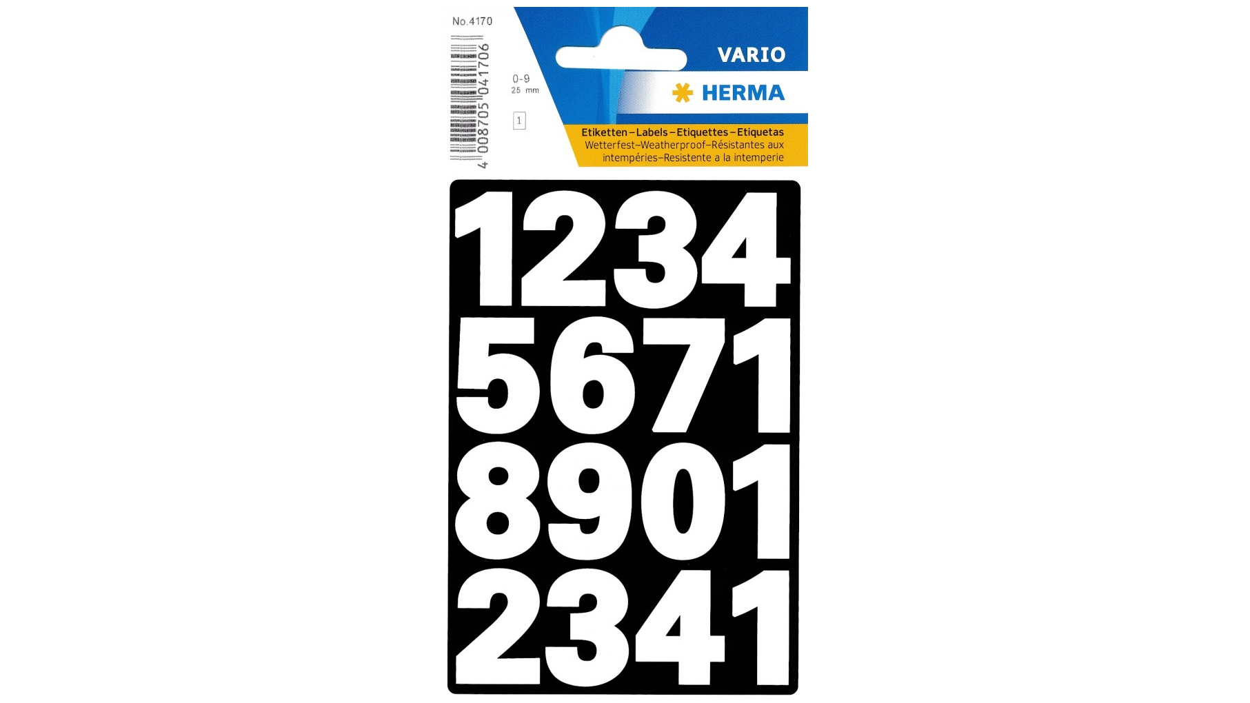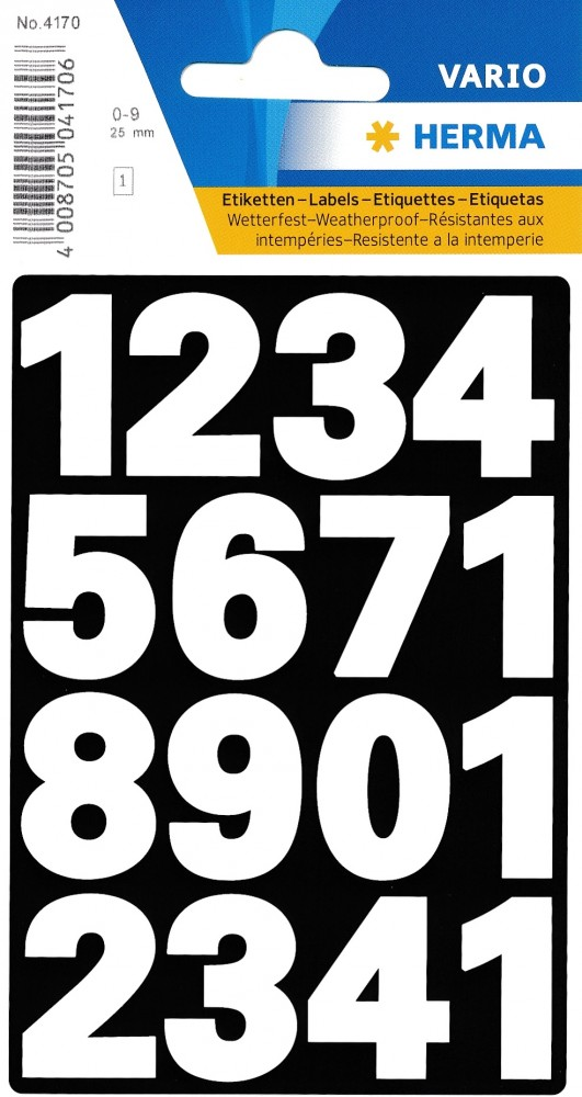 A HERMA számozott jelölőcímkék ideálisak egyedi feliratok készítéséhez otthon és munkában. A csomag 0-9-ig terjedő fekete számokat tartalmaz, amelyek tartós, időjárásálló fóliából készültek.