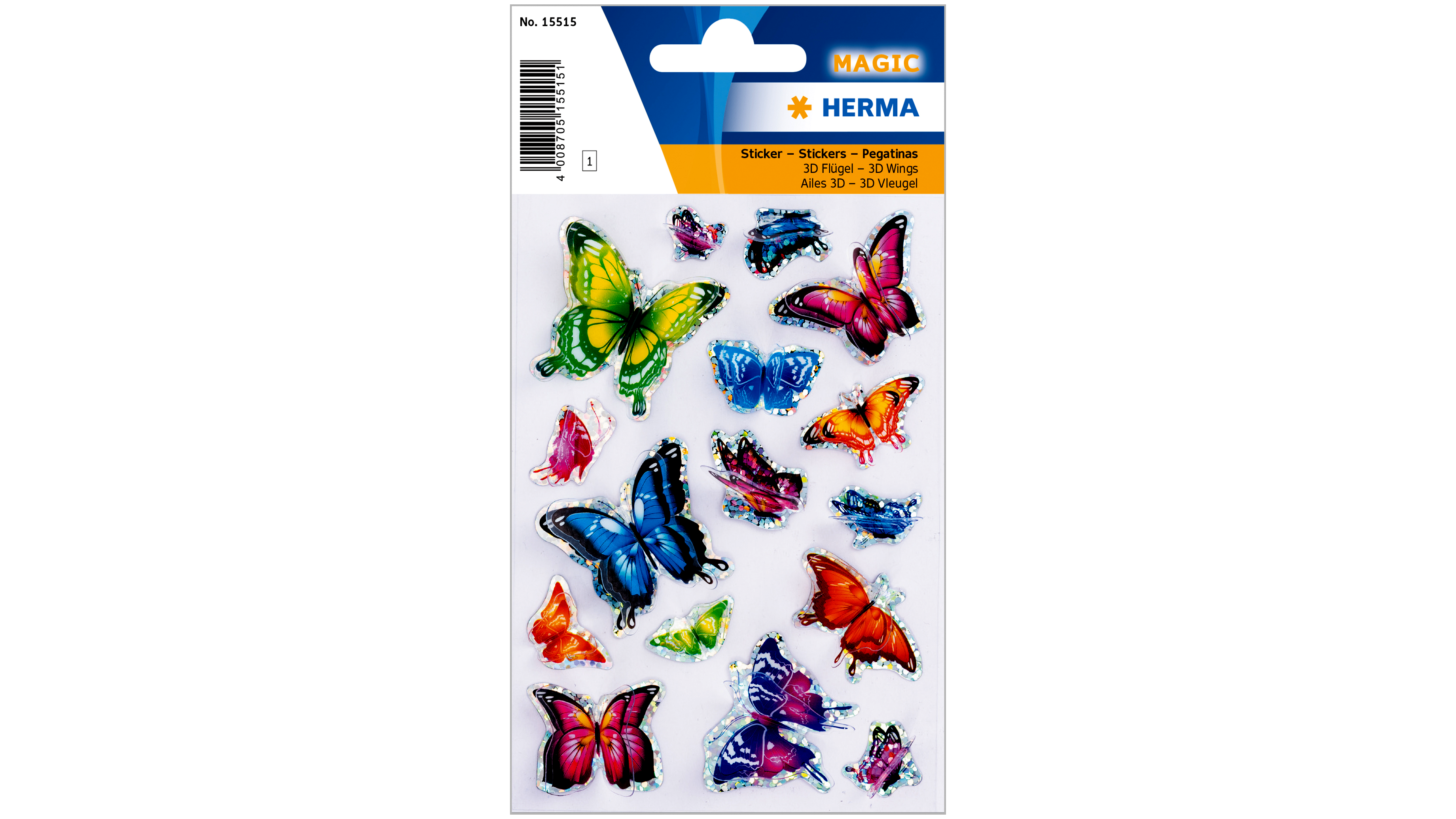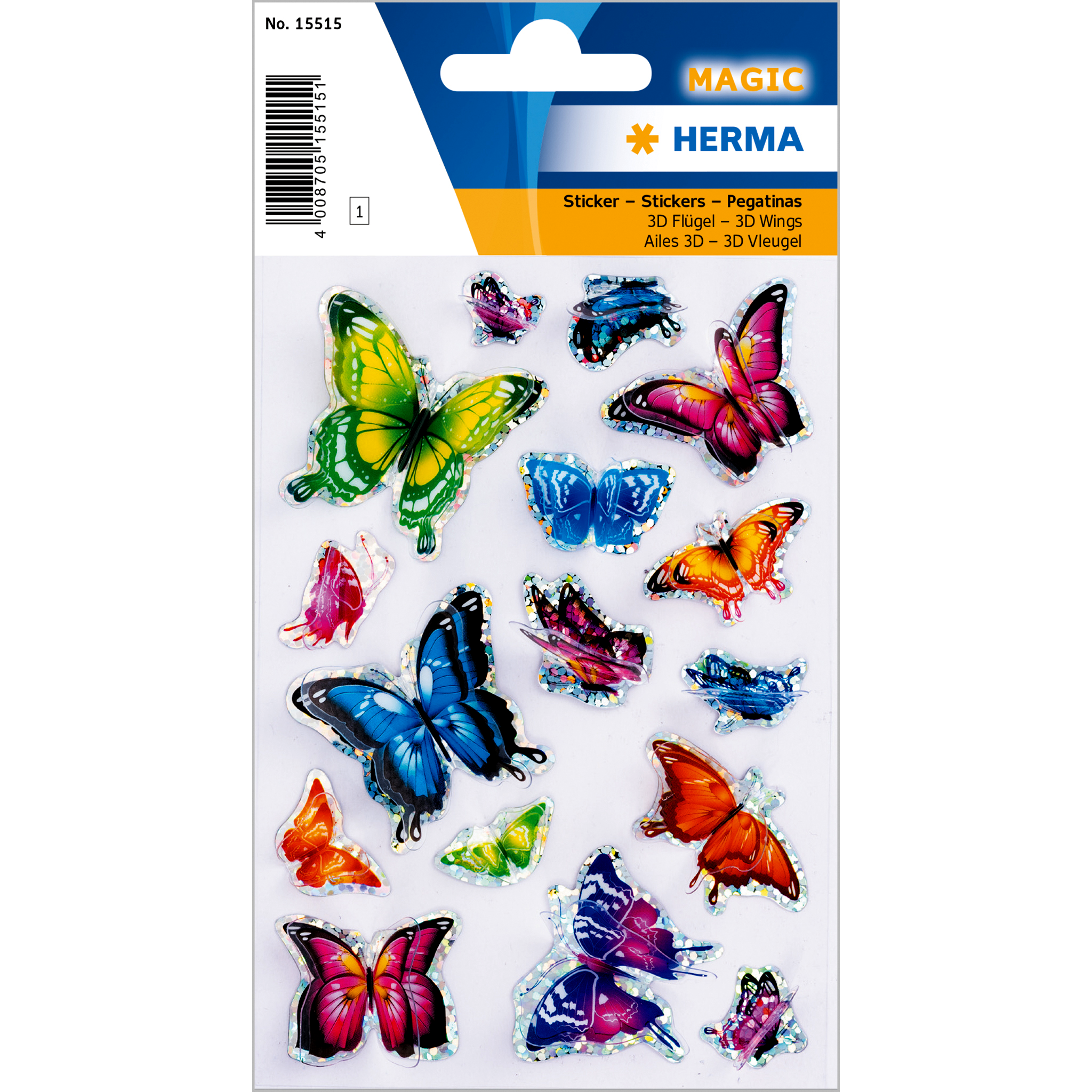 Öntapadós, színes pillangók, csillogó 3D szárnyakkal. Szépen mutathat egy születésnapi üdvözlő lapon vagy meghívón de matrica gyűjtő album különleges darabja is lehet. 1 lapon, 16 db matricát tartalmaz.