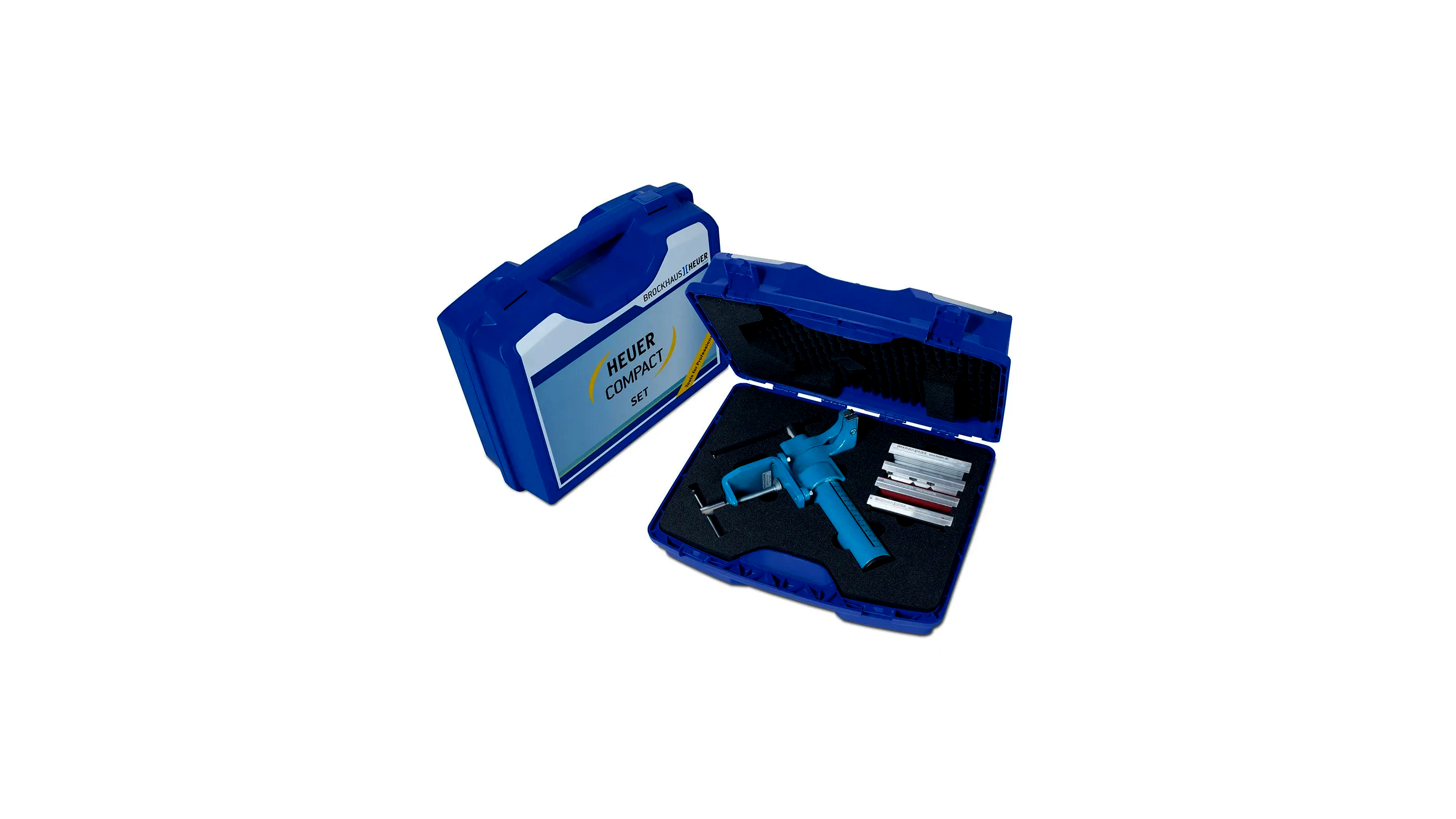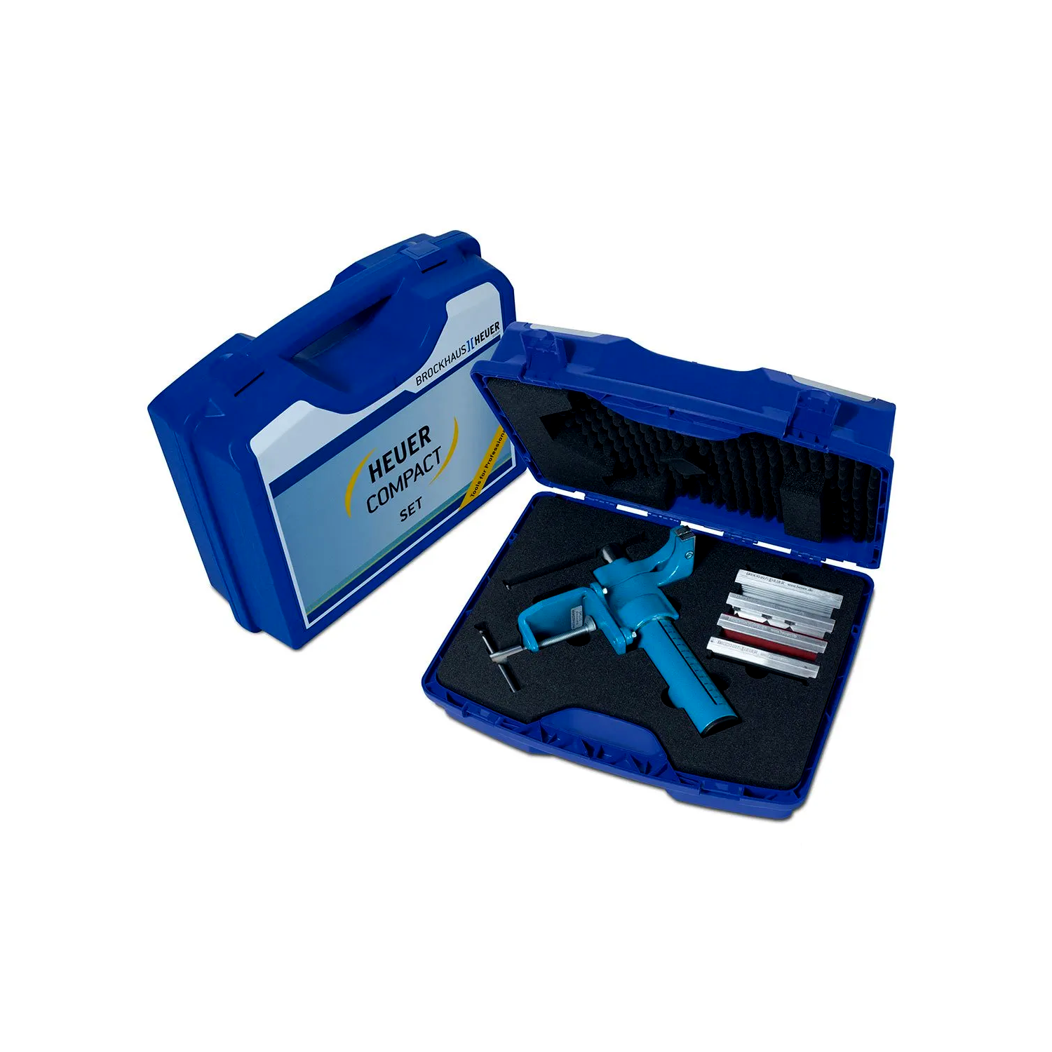 A Brockhaus HEUER cserélhető pofás kompakt satuja készletben, 4 db védőpofával, asztali gyorsrögzítős konzollal és praktikus hordozótáskával.