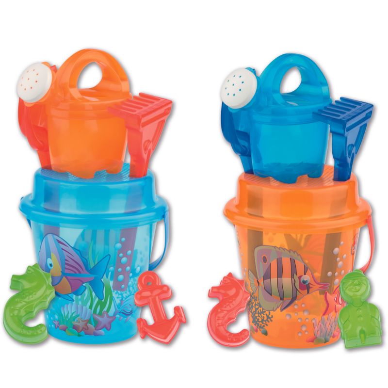 Vidám, átlátszó vödörrel rendelkező homokozó szett, amely egyaránt használható a kertben, a strandon vagy a tengerparton. Vastag, strapabíró műanyagból készült.
