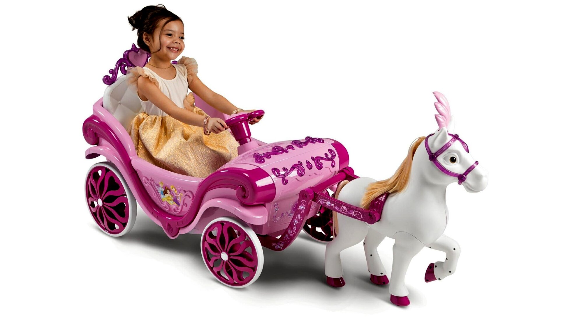 • Forduló, irányító lófigura: a királyi ló gördülő kerekein “siklik”, és kormányzáskor finoman elfordul, így varázslatos, mégis biztonságos irányítást ad a gyerek kezébe.