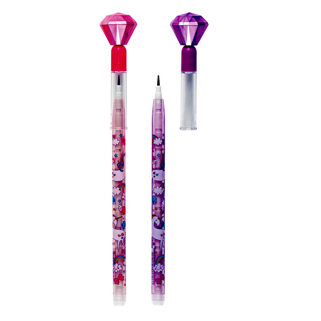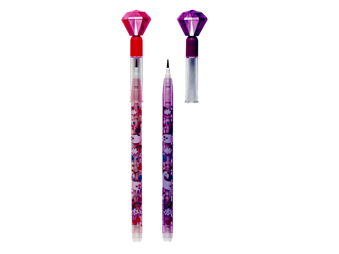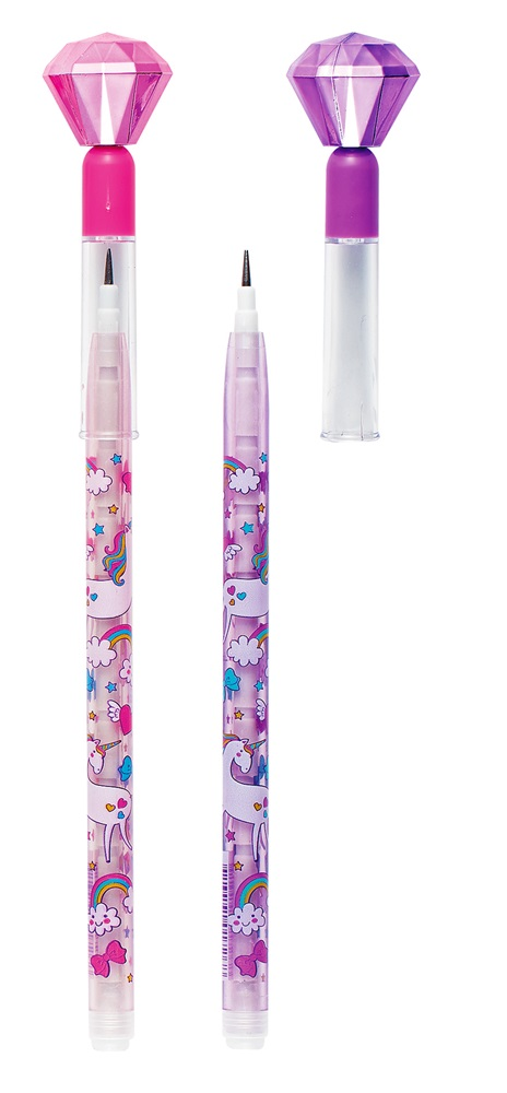 Ez az unikornis motívumos tolóbetétes ceruza tökéletes választás gyerekeknek, akik szeretik a varázslatos lényekkel díszített eszközöket. Az ékköves kupakdísz nem csak esztétikus, de praktikus is, biztosítva a grafit betét védelmét és hogy ne törjön el a táskában.