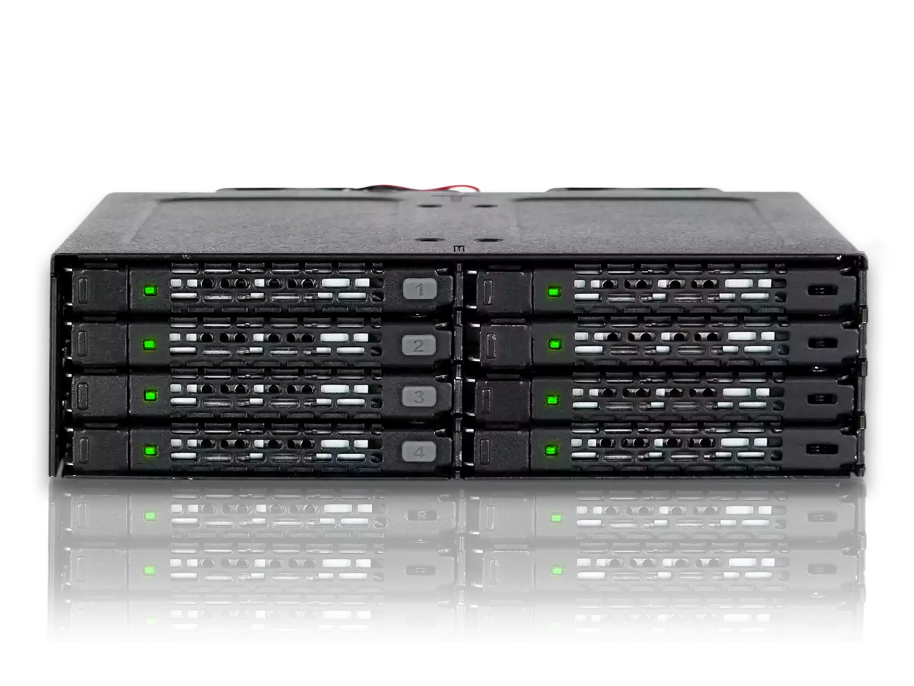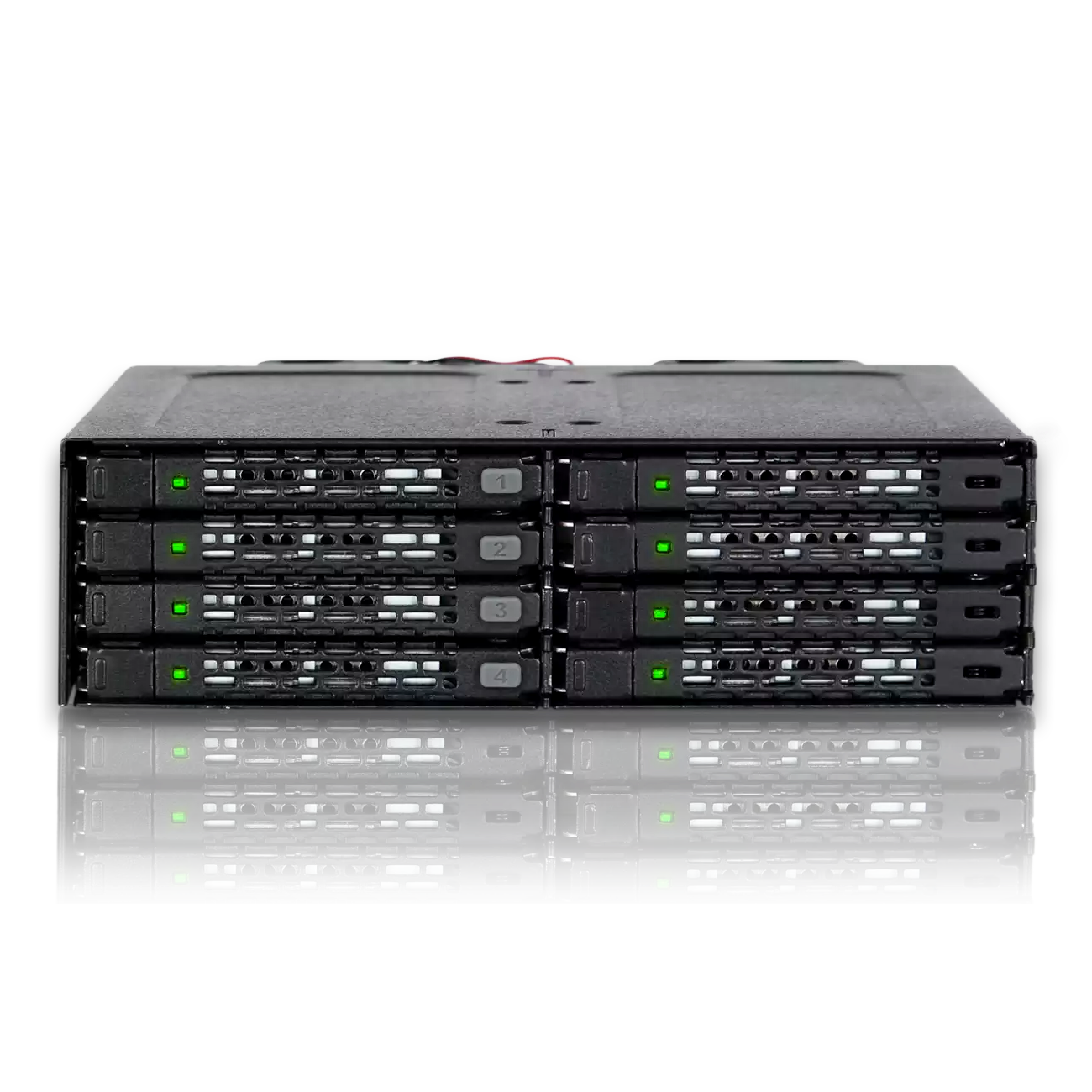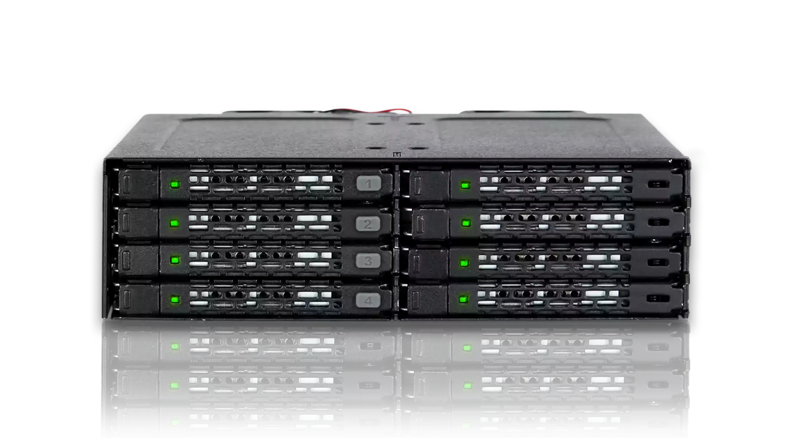 A beépített, hátoldali 2× 40 mm-es ventilátor gondoskodik a levegő áramlásáról a meghajtók között, míg a teljesen fém burkolat hatékony hőelvezetést biztosít. A stabil üzemi hőmérséklet növeli a meghajtók élettartamát és megbízhatóságát, ami különösen fontos folyamatos üzemben működő rendszerekben.