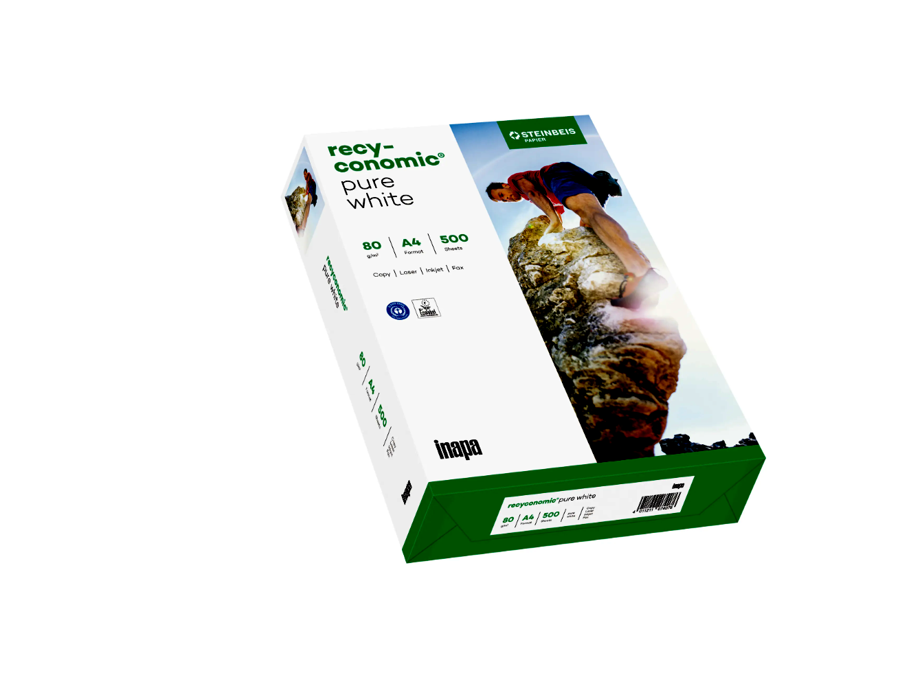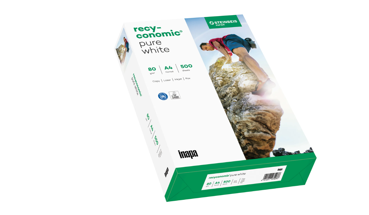 A Recyconomic Pure white A4 természetes fehér újrahasznosított papír, mindennapi használatra fénymásolókban, lézer- és tintasugaras nyomtatókban. Ez a csomag 500 DIN A4 formátumú, 80 g/m² súlyú papírlapot tartalmaz.