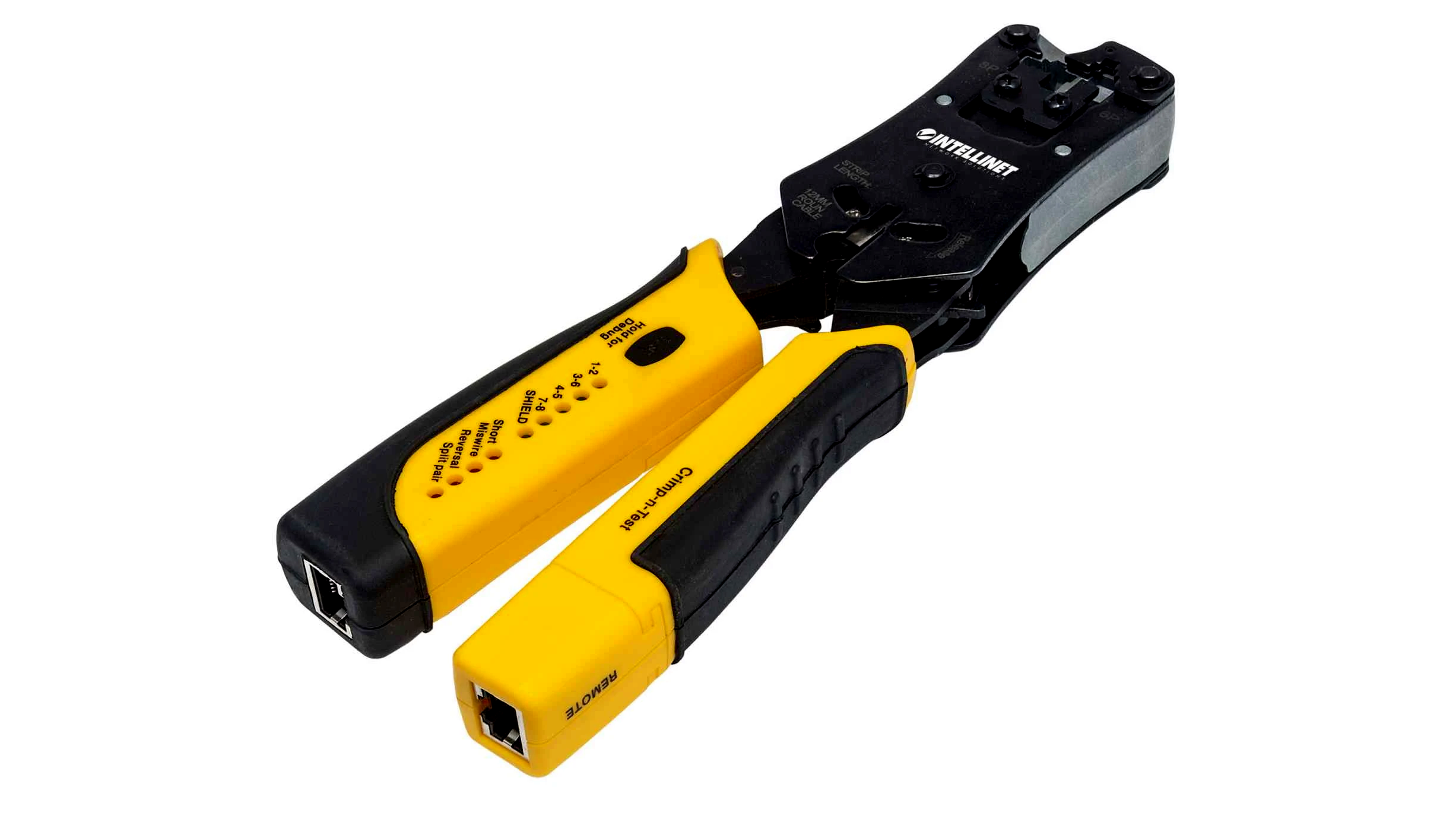 - All-in-one professzionális moduláris krimpelő szerszám vágási, csupaszító és kábel-tesztelő funkciókkal