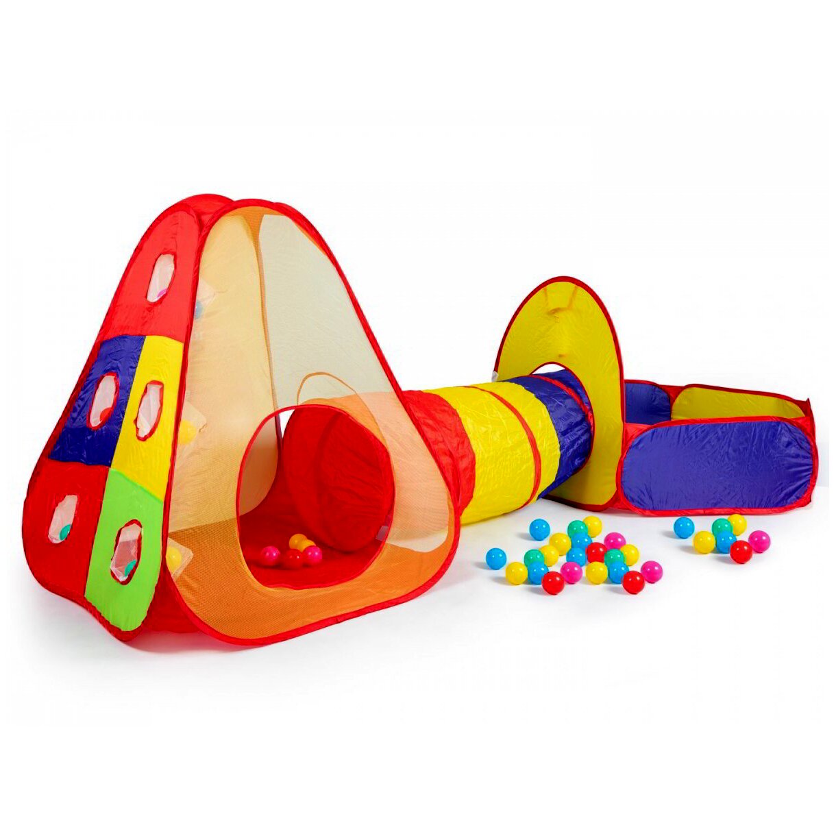 A szett 100 db labdát is tartalmaz, amiket csak bele kell önteni a medencébe és indulhat a szórakozás! Az alagutas sátor és a medence anyaga 100% poliészter.