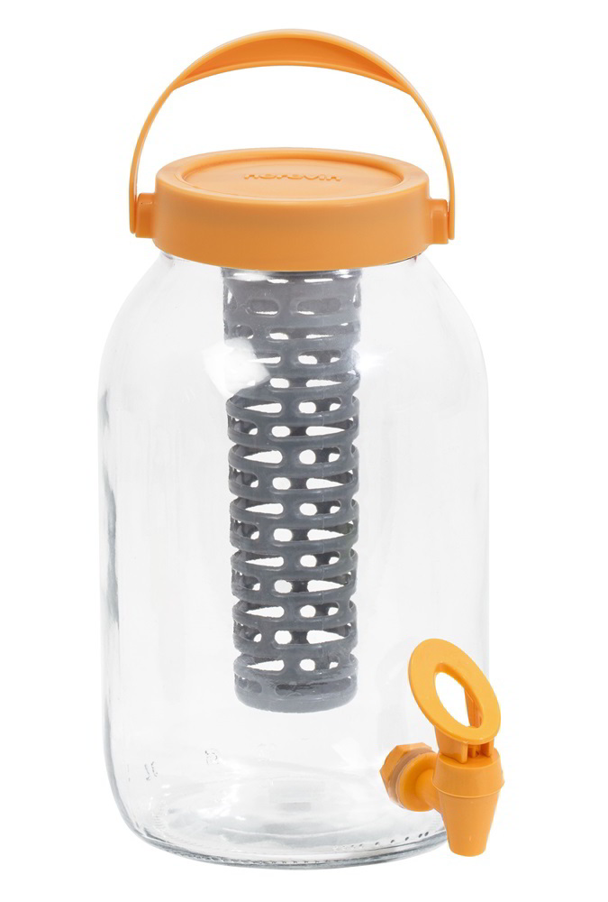 Dobd fel a mindennapi folyadékfogyasztást és a vendégvárást ezzel az elegáns, barack színvilágú üveg italadagolóval, amely a beépíthető gyümölcstartónak köszönhetően nemcsak dekoratív, hanem rendkívül praktikus is. Ideális limonádék, ízesített vizek, jeges teák, koktélok és alkoholmentes frissítők látványos tálalásához.