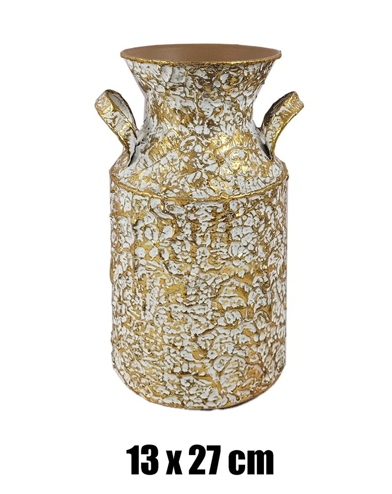 Az arany színű, fehér mintás felület különleges fényt ad a térnek, miközben nem tolakszik rá a környezetre. A bádog anyag könnyű, mégis stabil tartást biztosít, a két fül pedig nemcsak praktikus, hanem látványos design elem is, amely a vázát karakteressé teszi. A kb. 27 cm-es magasság univerzális méret: elegendően magas ahhoz, hogy hosszabb szárú díszeket is elbírjon, mégsem dominál túlzottan a térben.