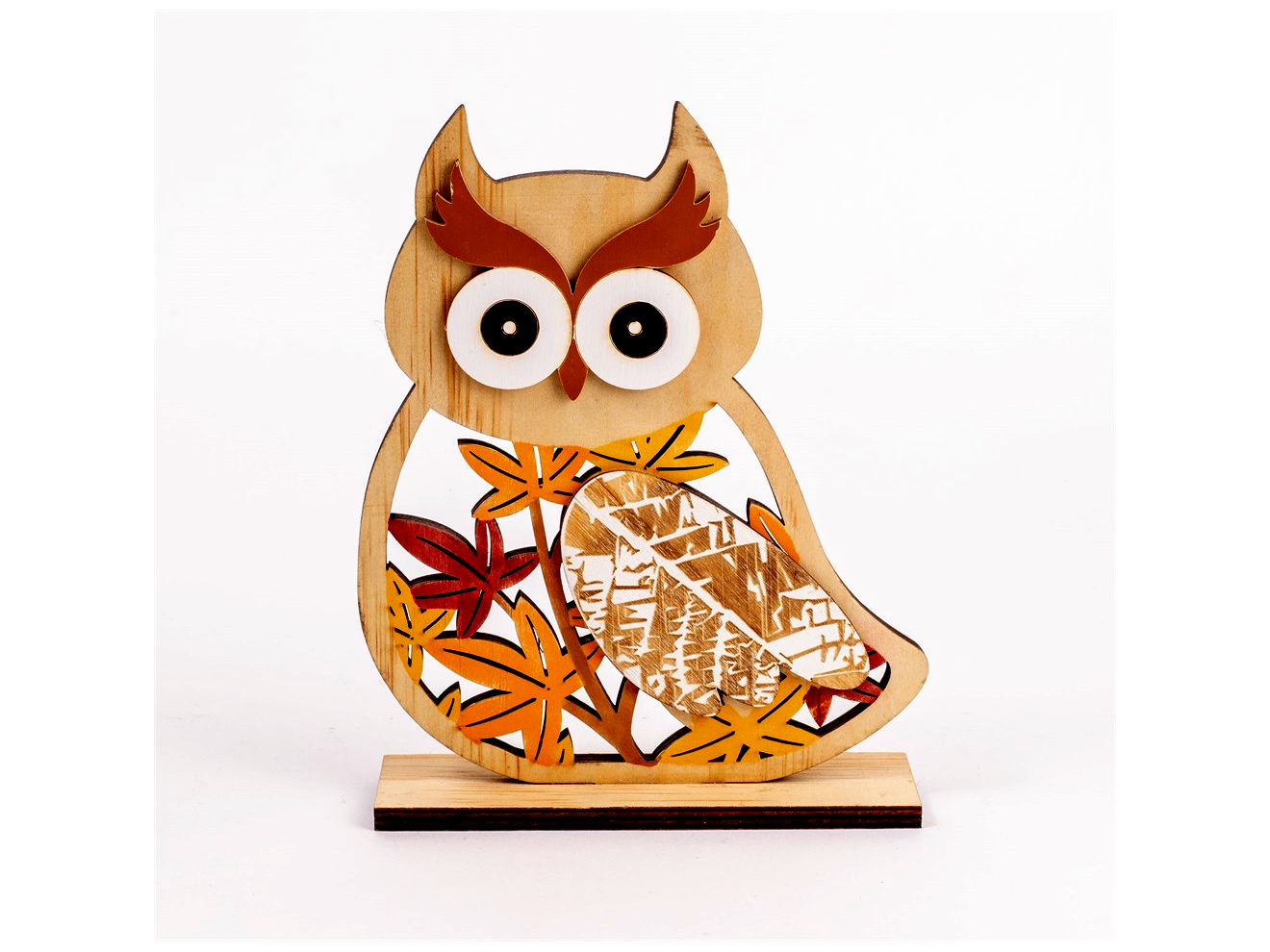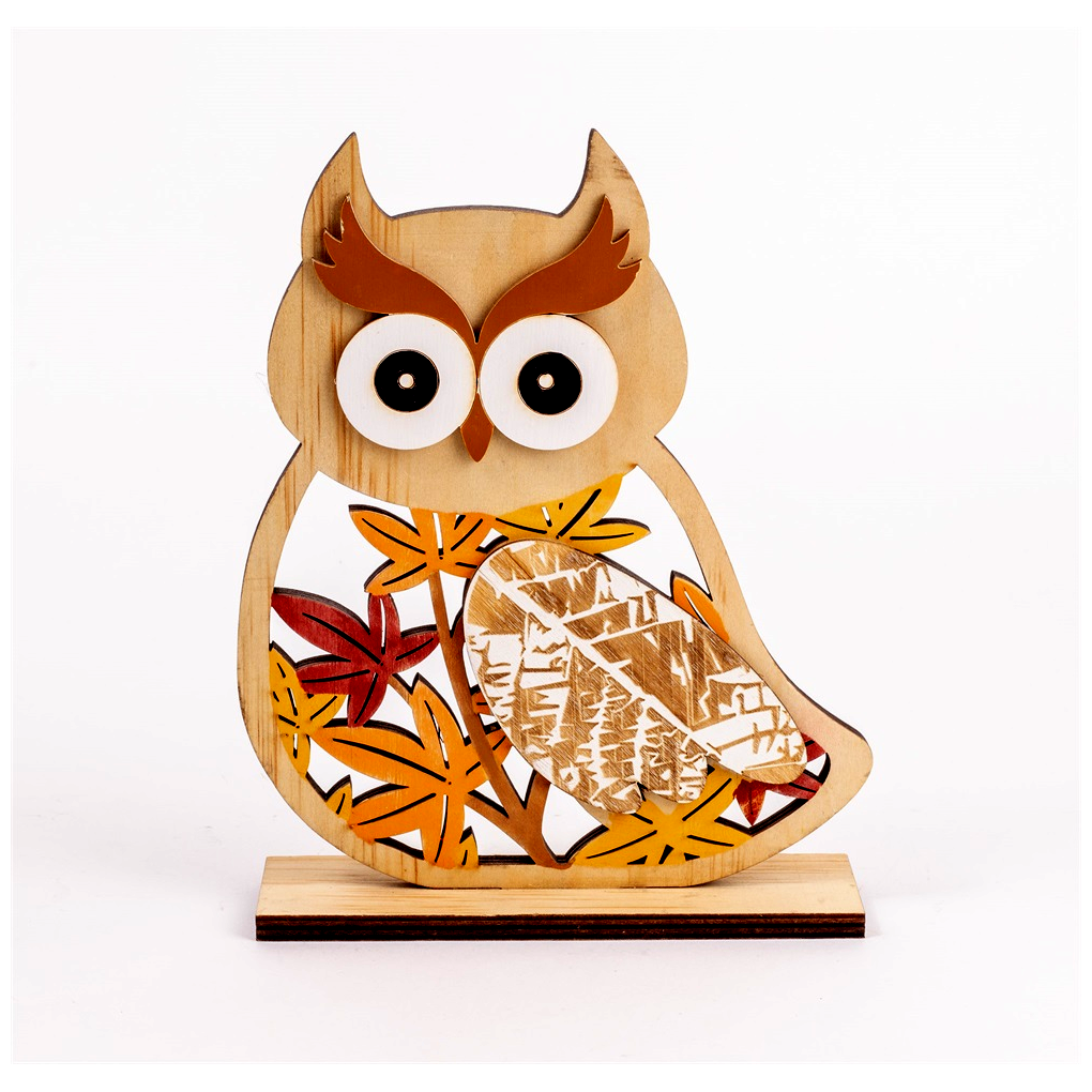 - 🦉 Bagoly mintás, falevél motívumokkal díszített fa dekoráció