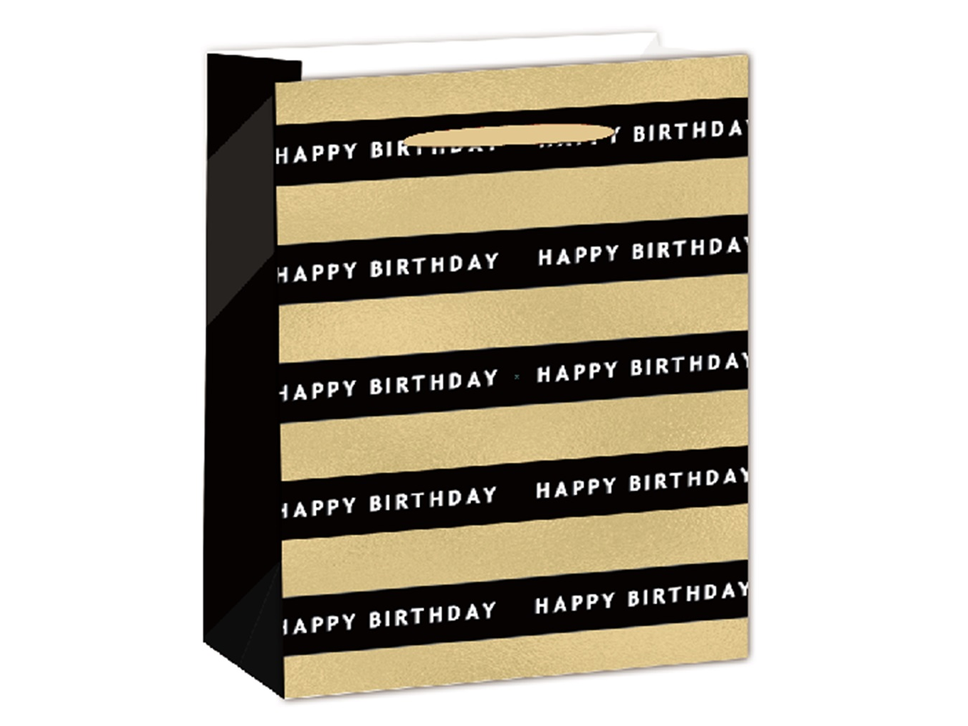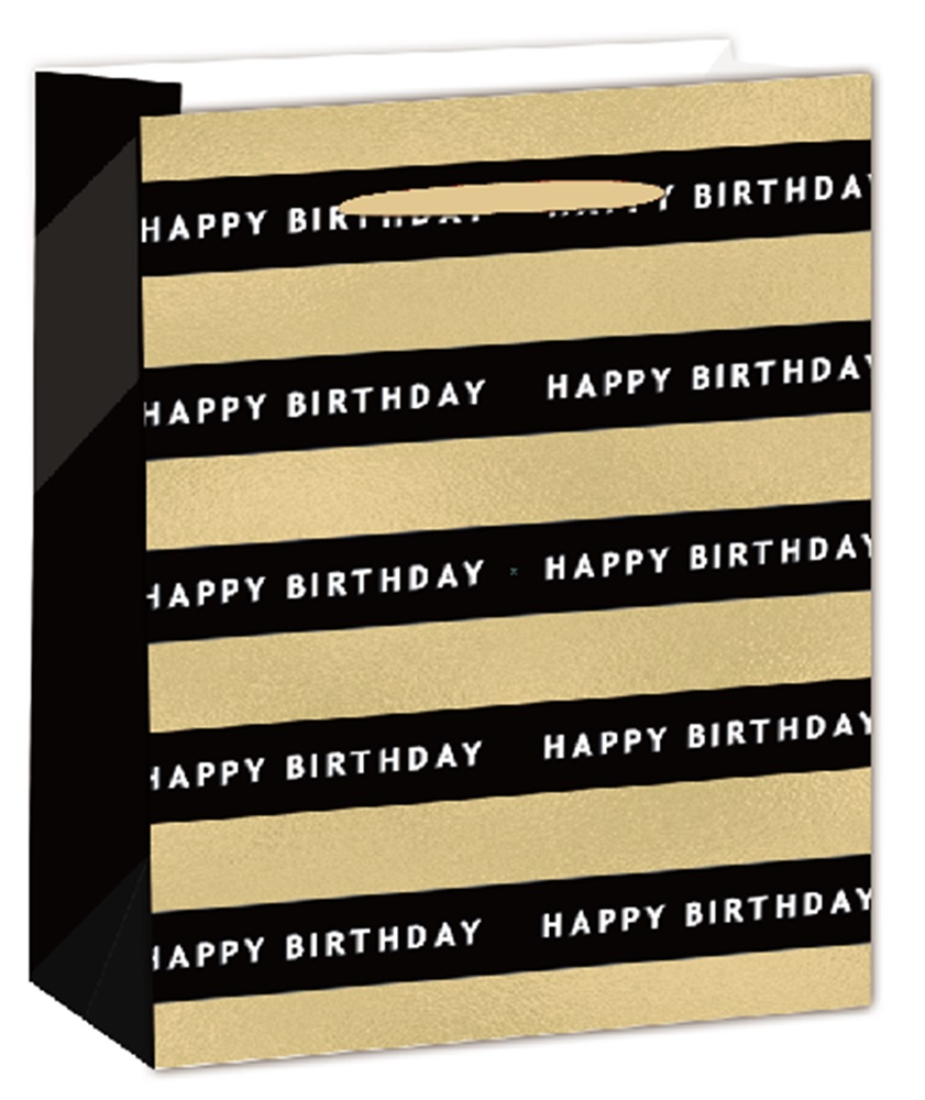 Lepje meg szeretteit stílusosan az Iris Happy Birthday feliratos hologrammos csíkos papír ajándéktáskával! Ez a különleges, fekete és arany színekben pompázó tasak tökéletes választás születésnapi ajándékokhoz, igazán elegáns és ünnepélyes megjelenést kölcsönözve mellékleteinek.