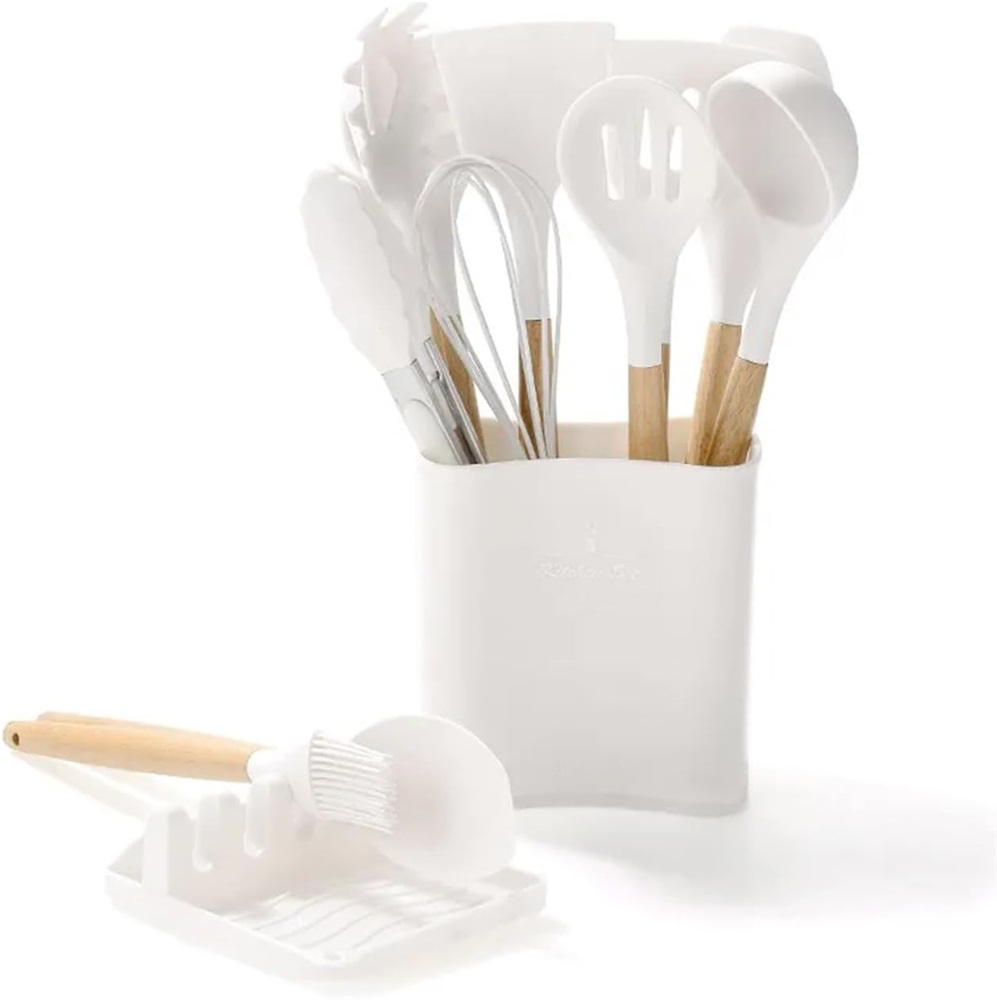 Ez a 13 darabos, fehér szilikon konyhai eszközszett ideális választás azoknak, akik egységes, letisztult és praktikus felszerelést szeretnének a konyhájukba. A hőálló szilikon fejeknek köszönhetően az eszközök kíméletesek a tapadásmentes bevonatú edényekhez, mégis elég erősek a mindennapi főzéshez, sütéshez és tálaláshoz.