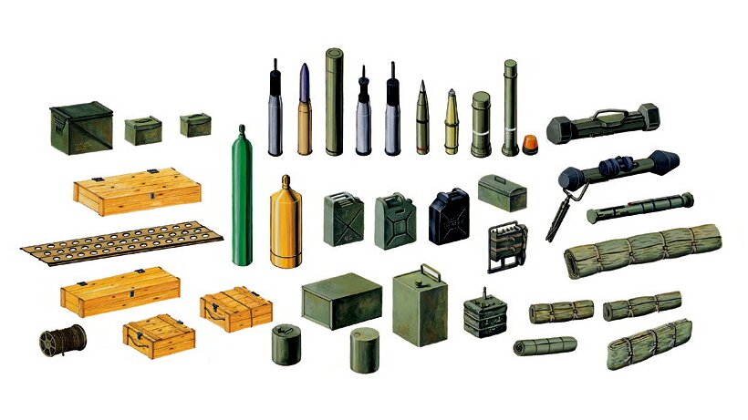 Lövedékek, páncéltörő rakétavetők, ládák, ponyvák és tartályok találhatók a dobozban.