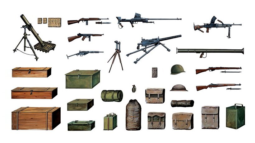 Az alkatrészek jól illeszkednek, kidolgozásuk tökéletes. A doboz ban géppuskákat, gyalogsági puskákat, támasztékokat, szuronyokat, kézigránátokat, könnyű páncéltörő fegyvereket, lőszertartókat, takarókat, táskákat, hátizsákokat, tokokat kézigránátokhoz, töltényeket és lövedékeket találunk.