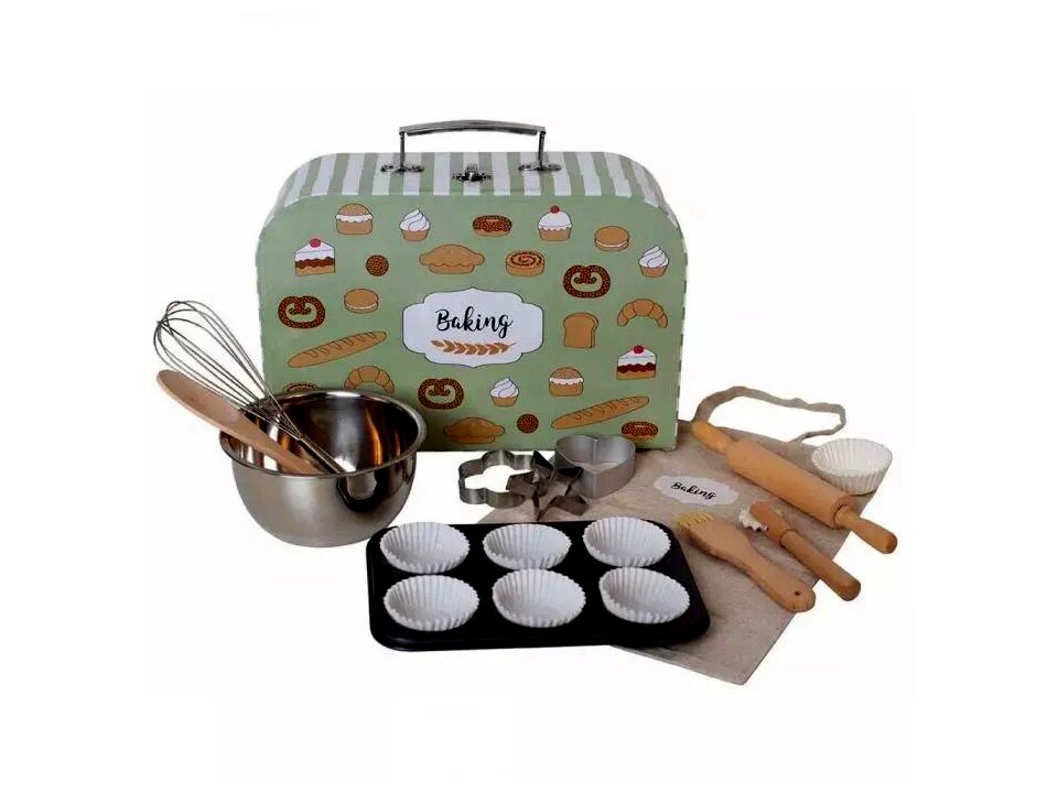A készletben található sodrófa, tál, habverő és még sok más kiegészítő szépen becsomagolva egy kis kukta bőröndbe kerültek. Minden kis cukrász álma, hogy saját eszközeivel dolgozhasson, és ebben a készletben minden szükséges eszköz megtalálható.
