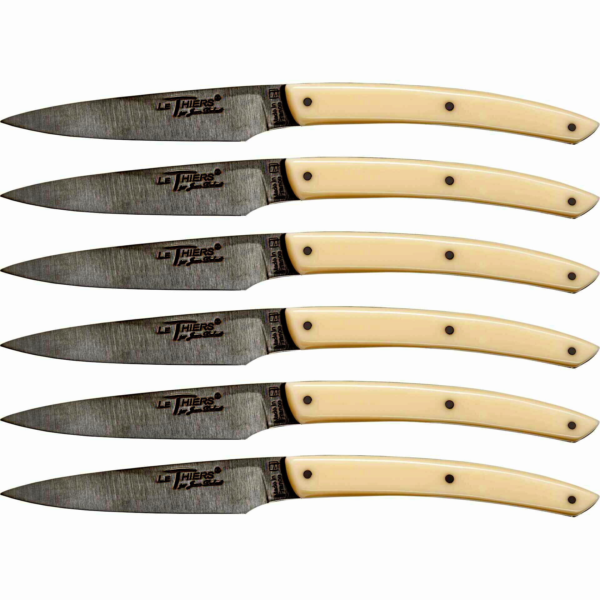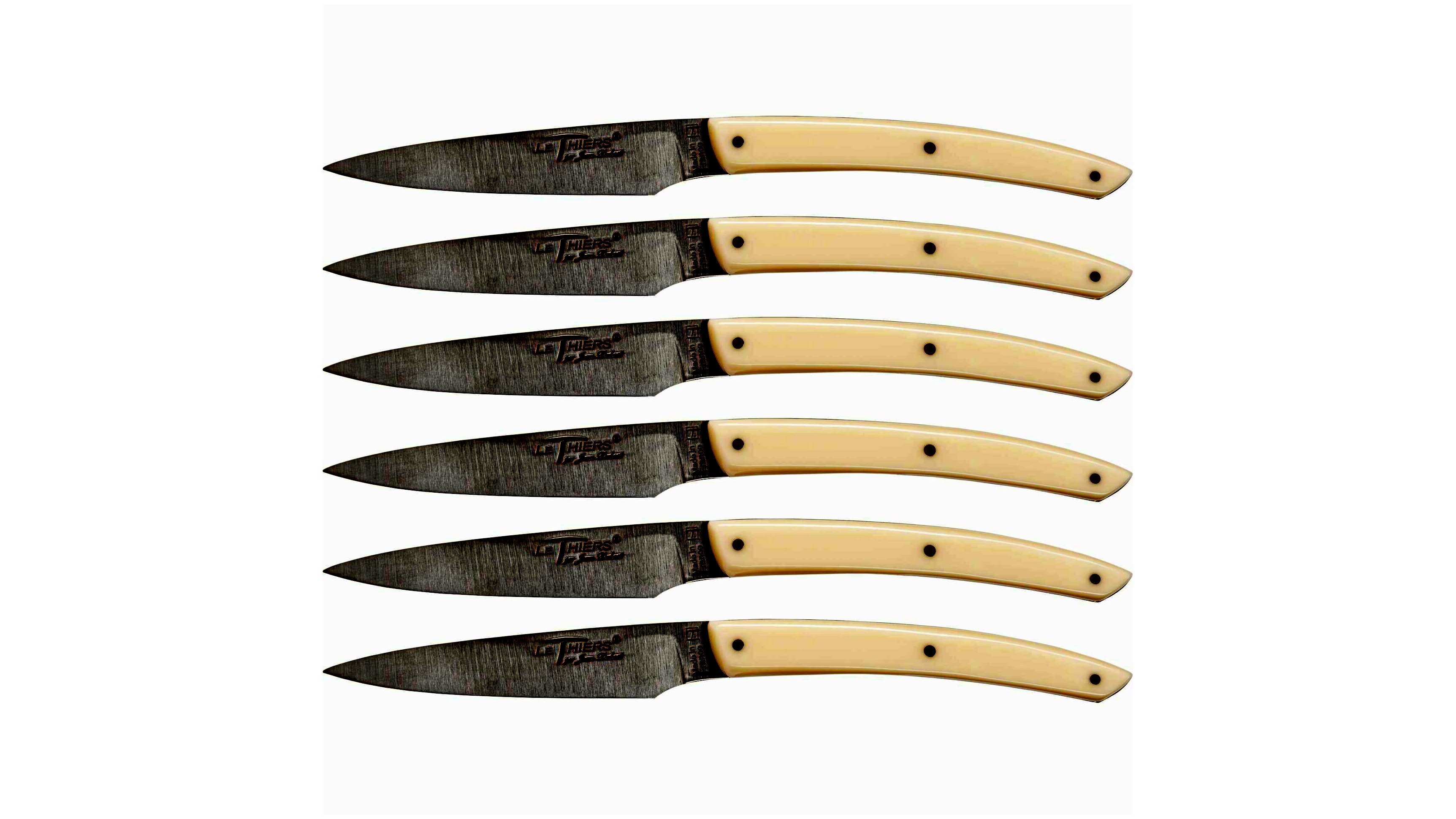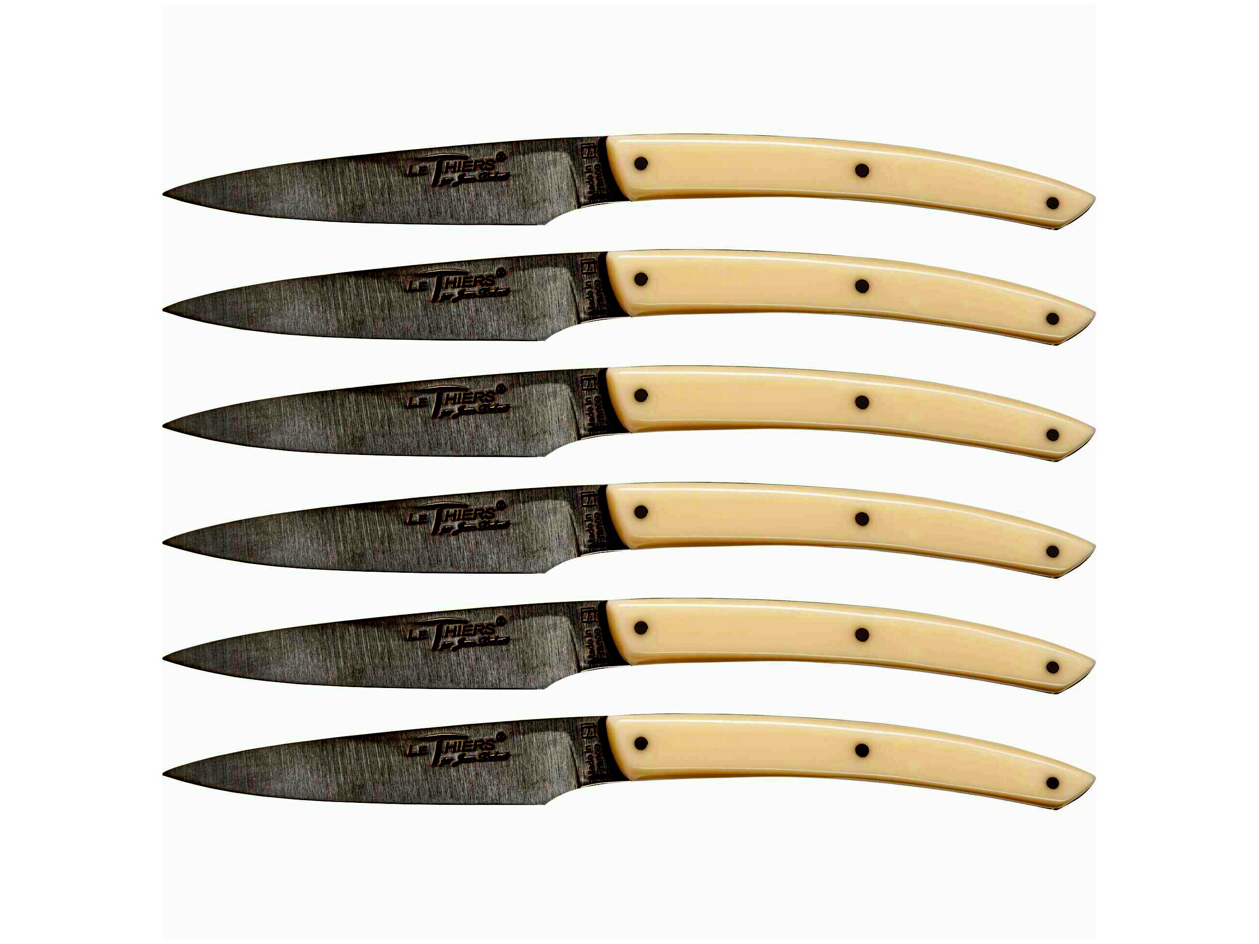 - Akril markolat: Az Ivory színű akril markolatok kényelmes és biztos fogást nyújtanak, miközben elegáns megjelenést kölcsönöznek a késeknek.