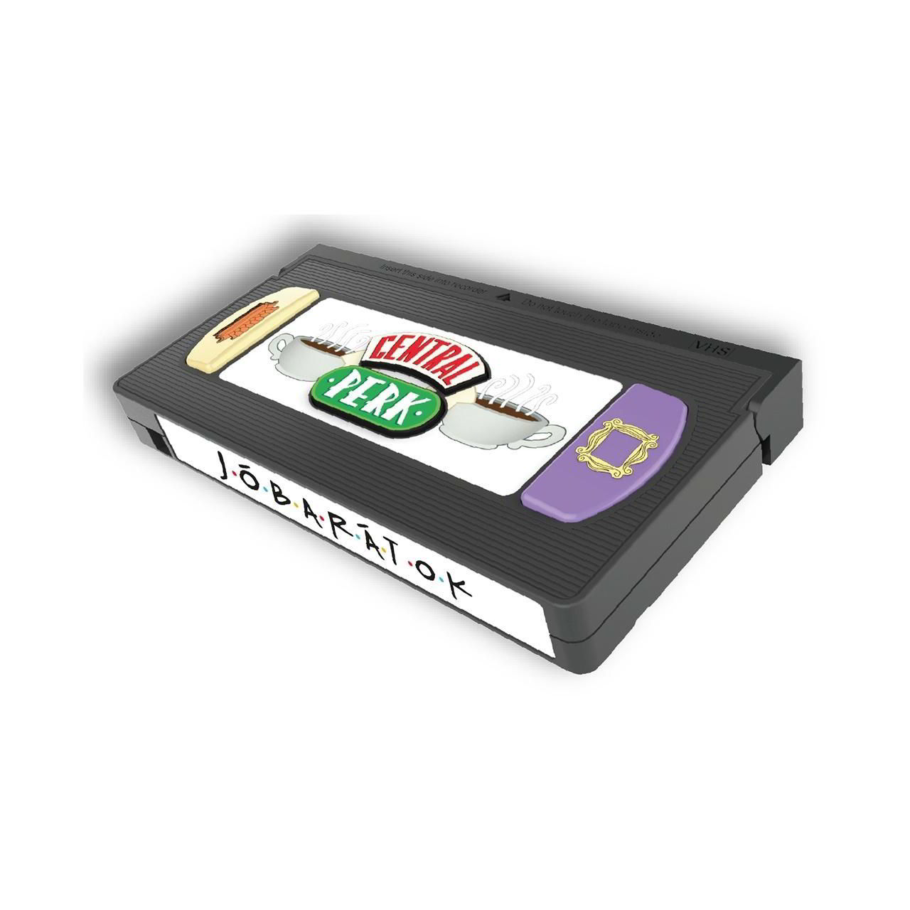 Jóbarátok családi társasjáték különleges, videokazetta formájú konzollal, amin a Central Perk kávézó logója szerepel. Ebben az interaktív kvíz társasjátékban most ti is kipróbálhatjátok tudásotokat a népszerű sorozattal kapcsolatosan. 500 kérdés vár megválaszolásra a játékosokra!